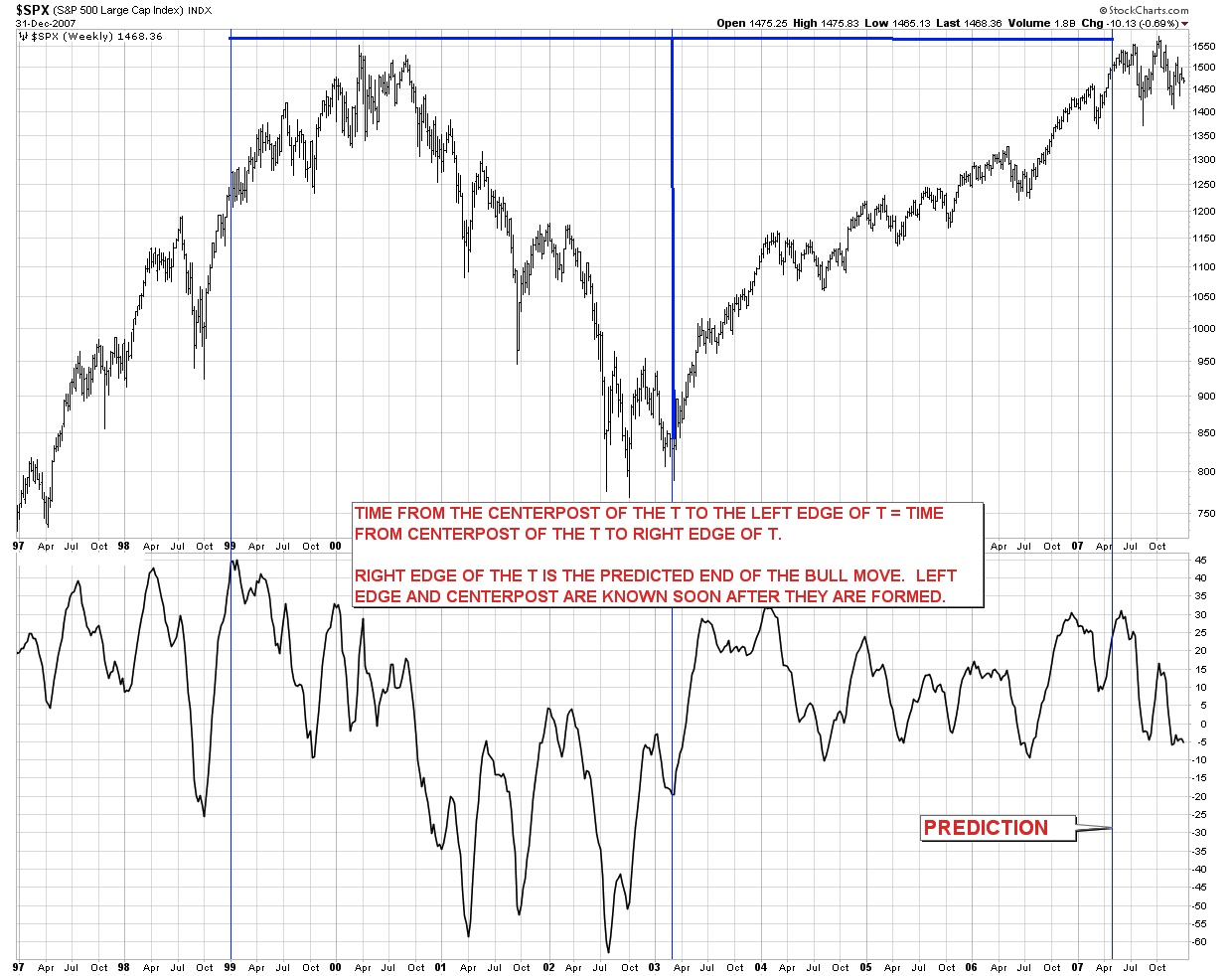 For those who don’t follow Terry’s methods, the end of the T (right side) is the predicted termination point for the bull move.  Ts usually range in length from a few months to years.  The center post of the T is “in the neighborhood” of the reversal date.  The following chart is an illustration of the T.