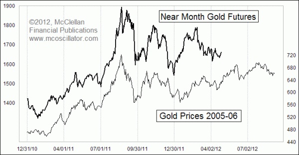 McClellan published an interesting chart recently that shows a relationship between the movement of gold during 2005 and the present.  Chart #40.3 in MY CHARTS shows a possible wave count for gold, which if correct means gold could move upward soon.  As McClellan points out, gold has a strong positive correlationship to stocks and a strong negative corelationship to the US Dollar.  In order for gold to advance from this point, stocks must advance and if the dollar goes down, this will likely take place.