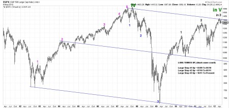 We have a significantly higher high than step 2 and this is all that’s necessary to qualify for third step.  An early end to a step is normally caused by something happening that the market hadn’t anticipated.  In the SP 500 chart, 3rd step ended in July 2007, while 3rd step ended in October 2007 for the DJ Industrials.