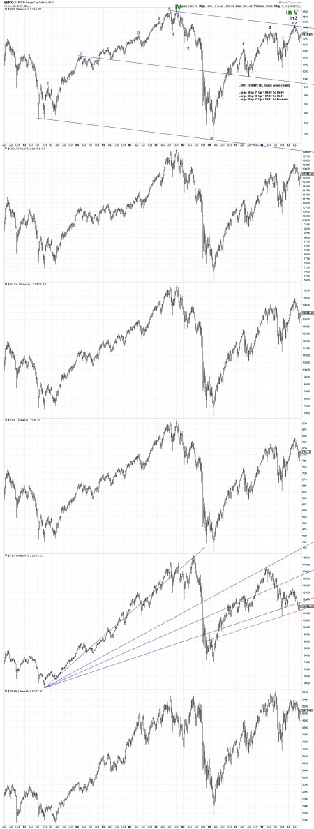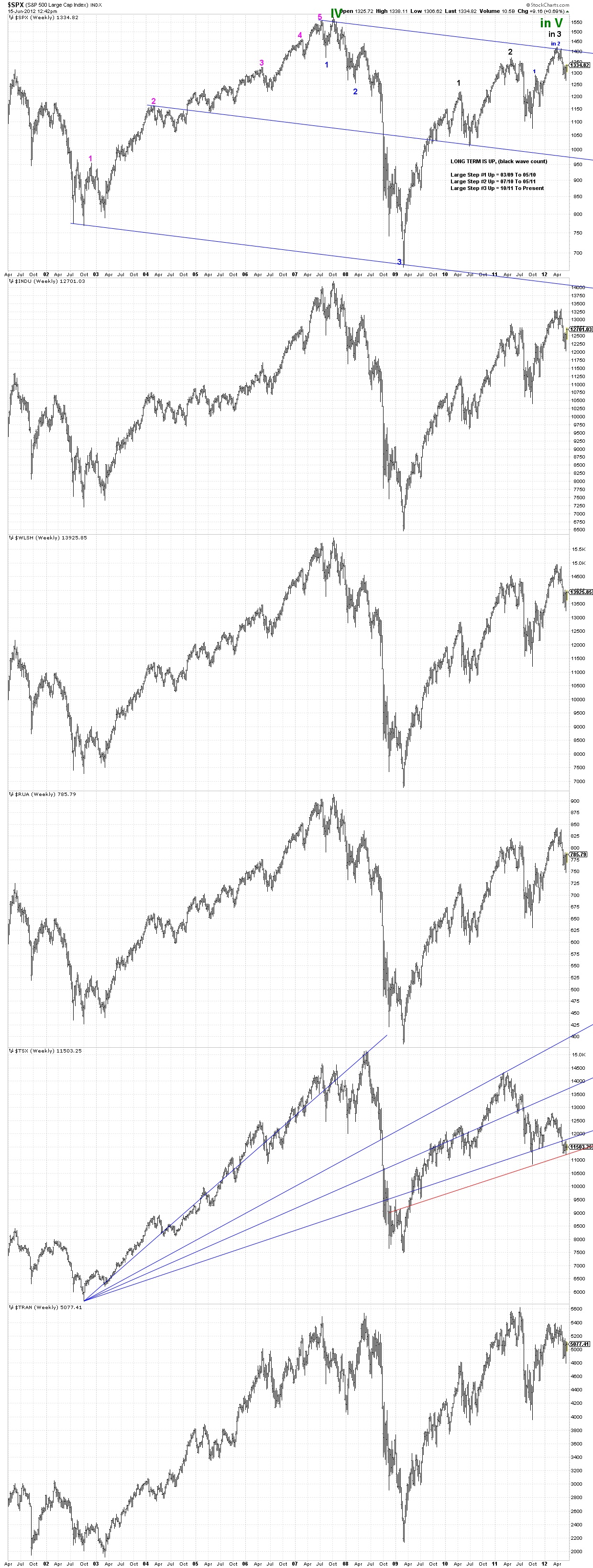 A scary long term chart follows.  Note the trendlines on the first chart, SPX.  The lowest trendline is the primary line connecting the bottoms.  The top trendline shows a “possible” long term peak around April 1st.  This is probably only a resistance area and will be overcome if we remain in a primary bull market.  Only a failure to achieve new highs will validate this trendline reversal.