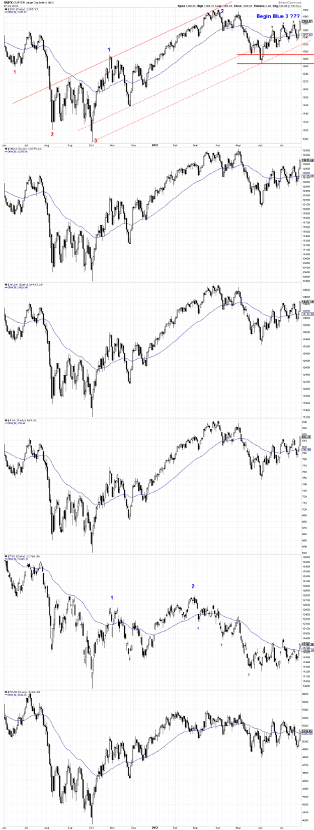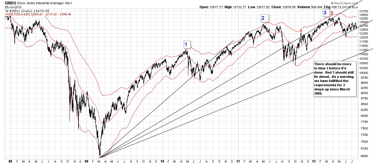 Looking at the above chart, it’s an obvious fact that we have 3 well defined steps up since March 2009. When 3 long term steps are completed, there is always the “possibility” of a bear market. Sometimes we have 5 steps up and maybe that will take place in this bull market. At the moment, it’s unresolved whether the 3rd step (blue 3) is finished. It’s unresolved in that red peak #3 is missing. Or maybe the red count is incorrect and the step from October 2011 to April 2012 is step 1 of blue 3. With that count interpretation we could be ready to embark on step 2 of blue 3 with an extended bull market. We’ll see how this works out.