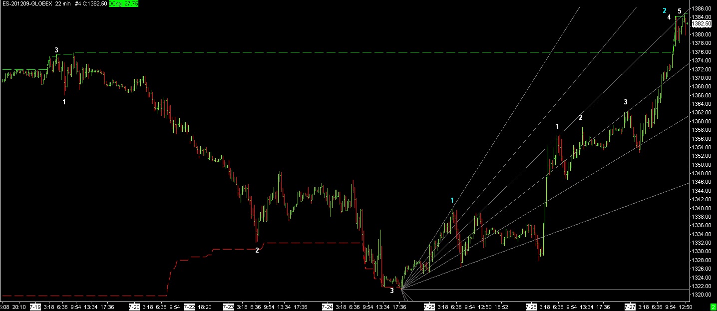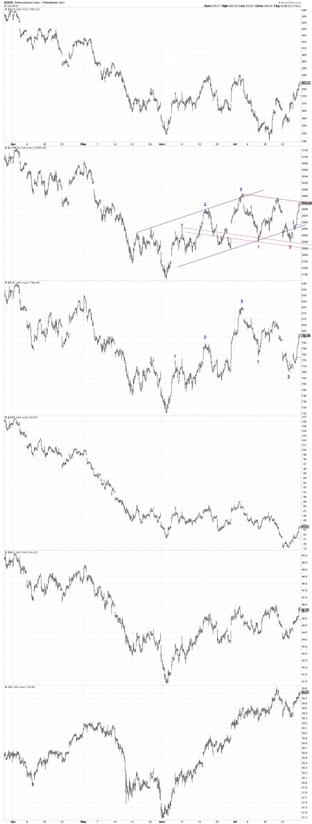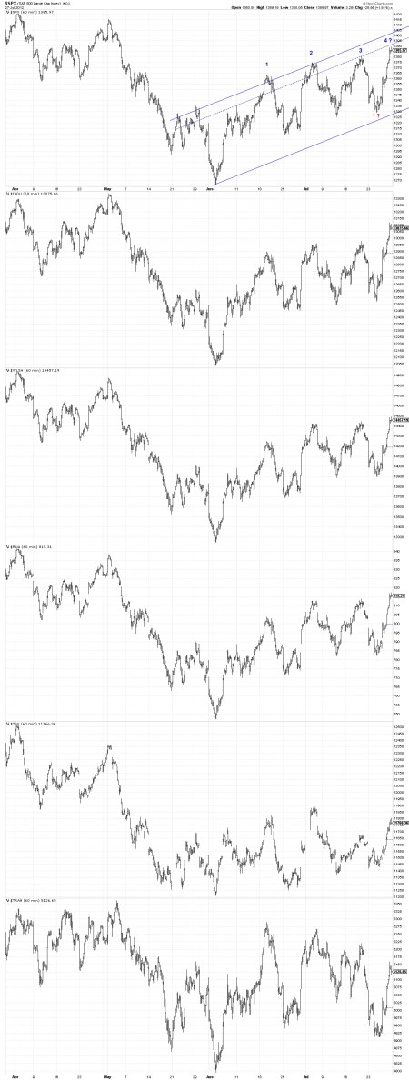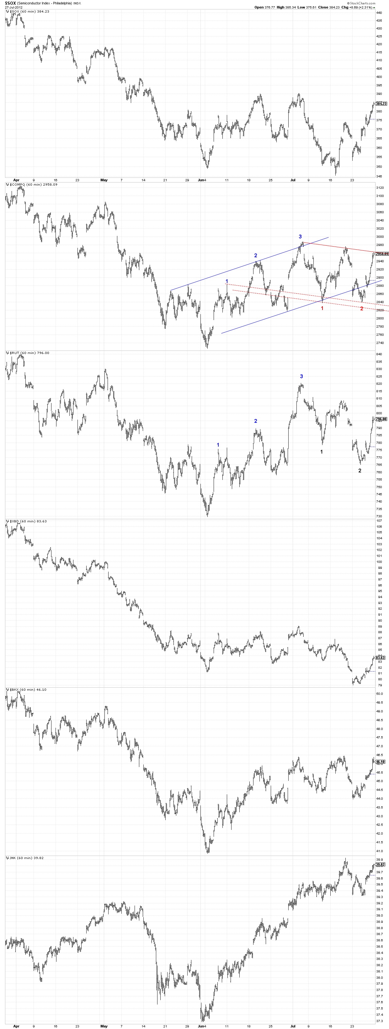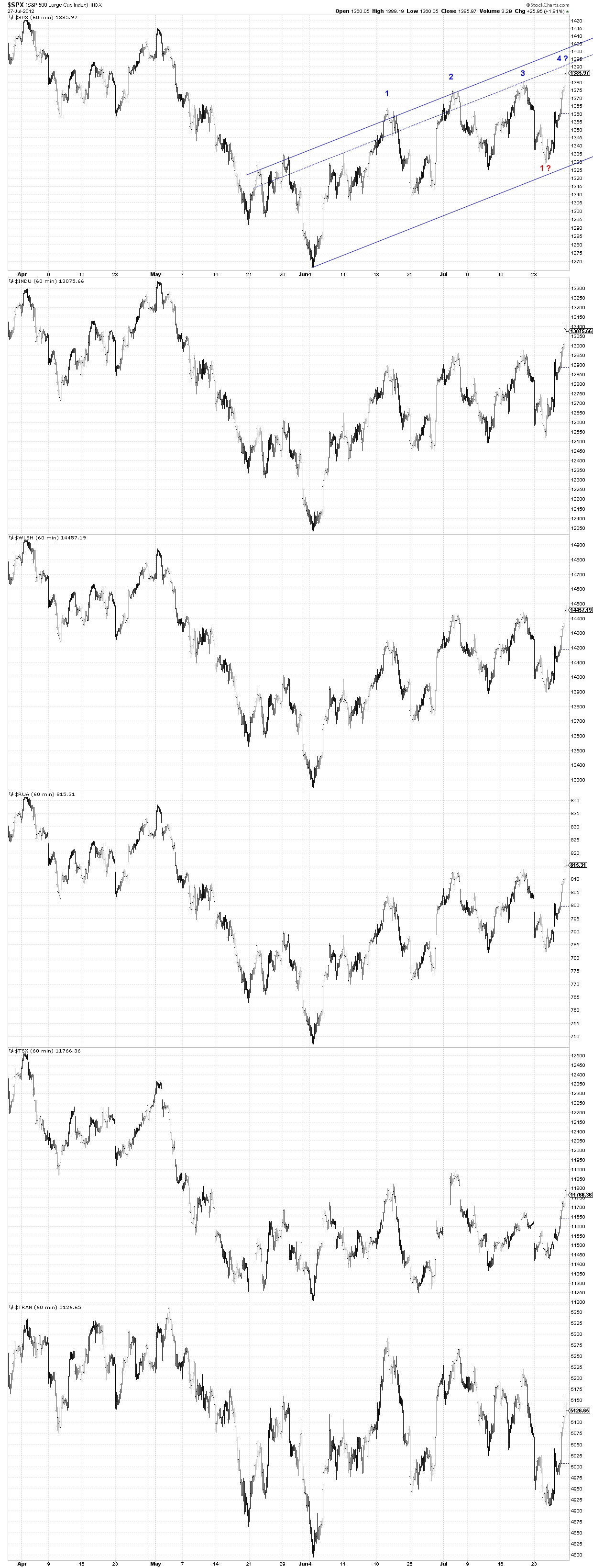 The next chart shows 5th step in cyan since June 4th. There is always the possibility that cyan steps 1 and 2 are one step. The charts following (60 minute StockCharts) show only 4 steps up. The 24 hour futures have usually been more accurate on detailing the wave count.