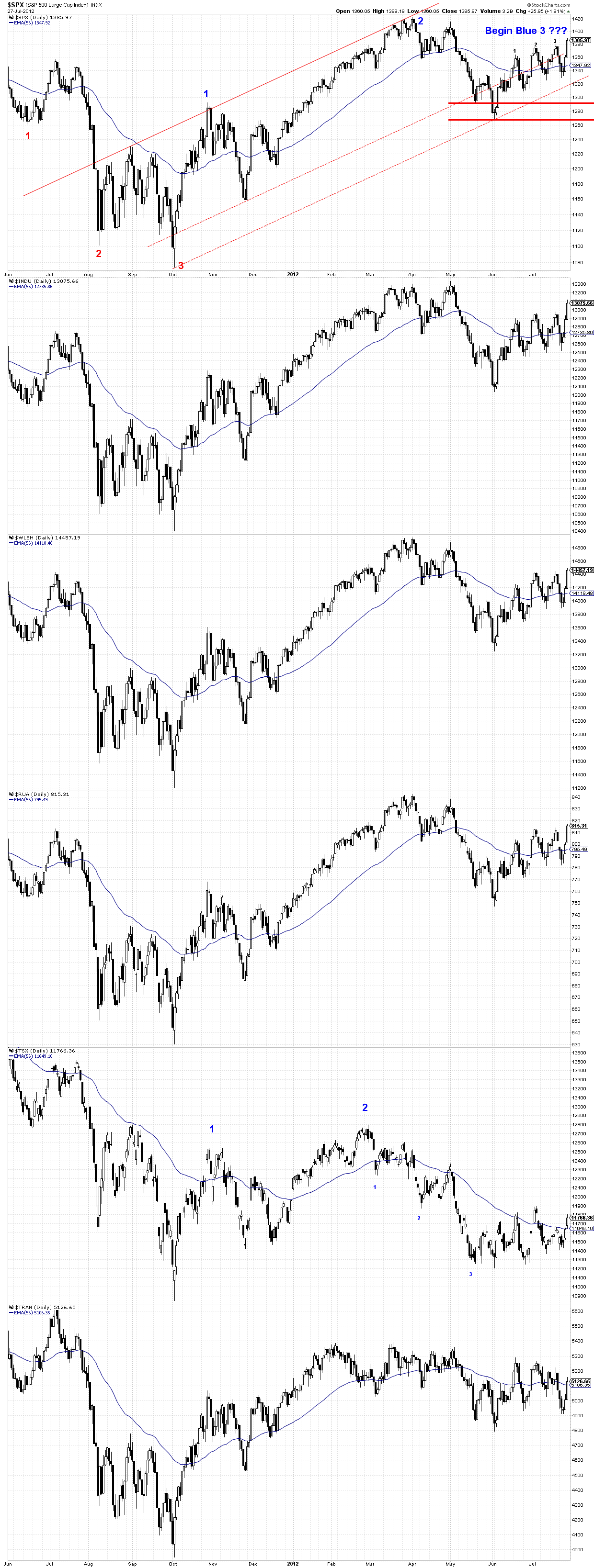 Look back at the last peak of significance, July 2007. The October 2007 peak was a price peak for only a few of the indexes. There were non-confirmations in October 2007. Guess what??? We have non-confirmations going on presently. That’s gotta get fixed or somethings gonna go wrong.