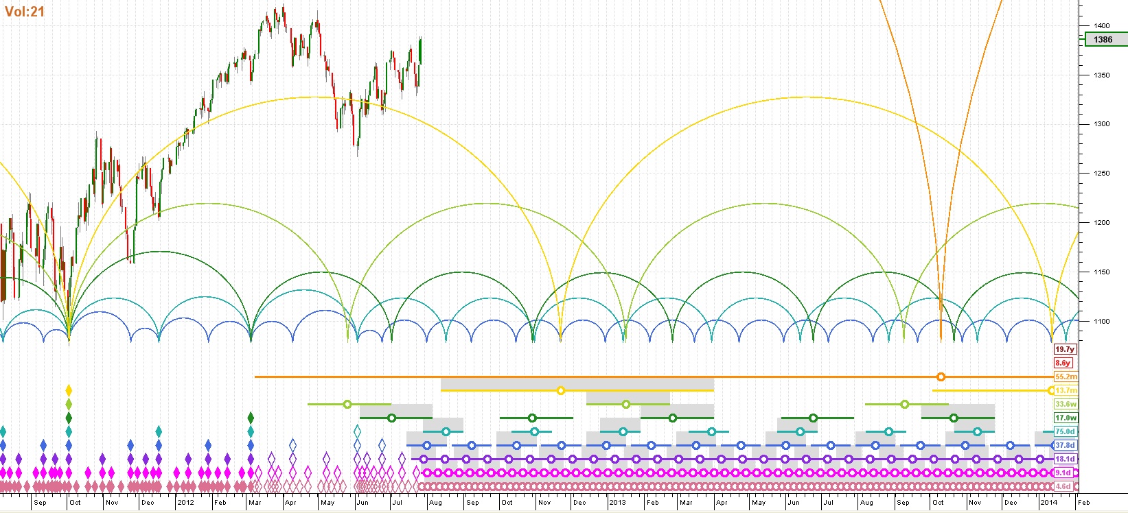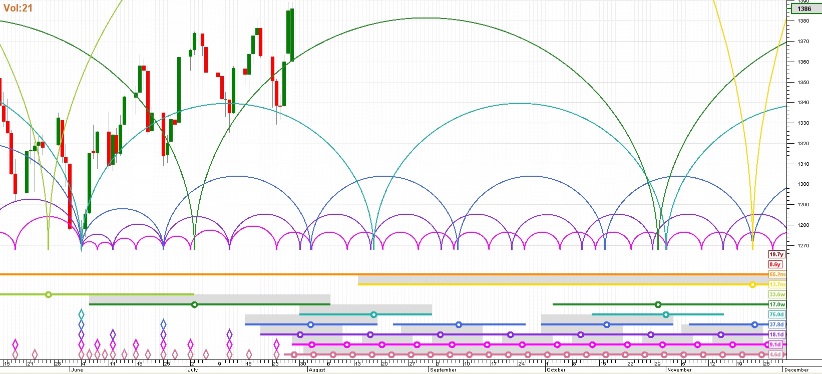 The first chart is the close up view and notice there is some difficulty determining the precise location of the longer term cycle shown bottoming in May. The long term cycle bottomed in late May and some shorter cycles bottomed in early June. Hurst’s Principle of Synchronicity states – “Waves in price movement are phased so as to cause simultaneous troughs wherever possible”. Synchronicity means this variation on the cycle bottoms can’t take place in May and June. The software obviously needs more data (future data) before it can reach a decision on the common cycle bottom.