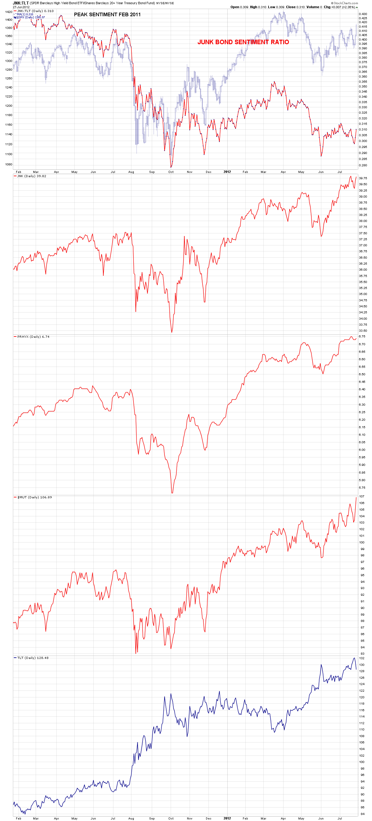 The next chart is the junk bond sentiment index. This index peaked in February 2011 and has trended steadily lower since then. A reversal in interest rates (rising rates) would change this picture dramatically, but would we see a new high??
