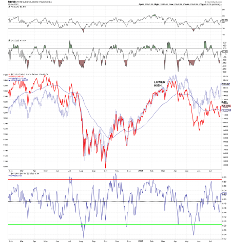First chart is the up down volume cumulative line. This index peaked in February 2011 and made a secondary high in late March 2012. So far it is lower highs since 2/11. We need to break this trend or problems lie ahead.