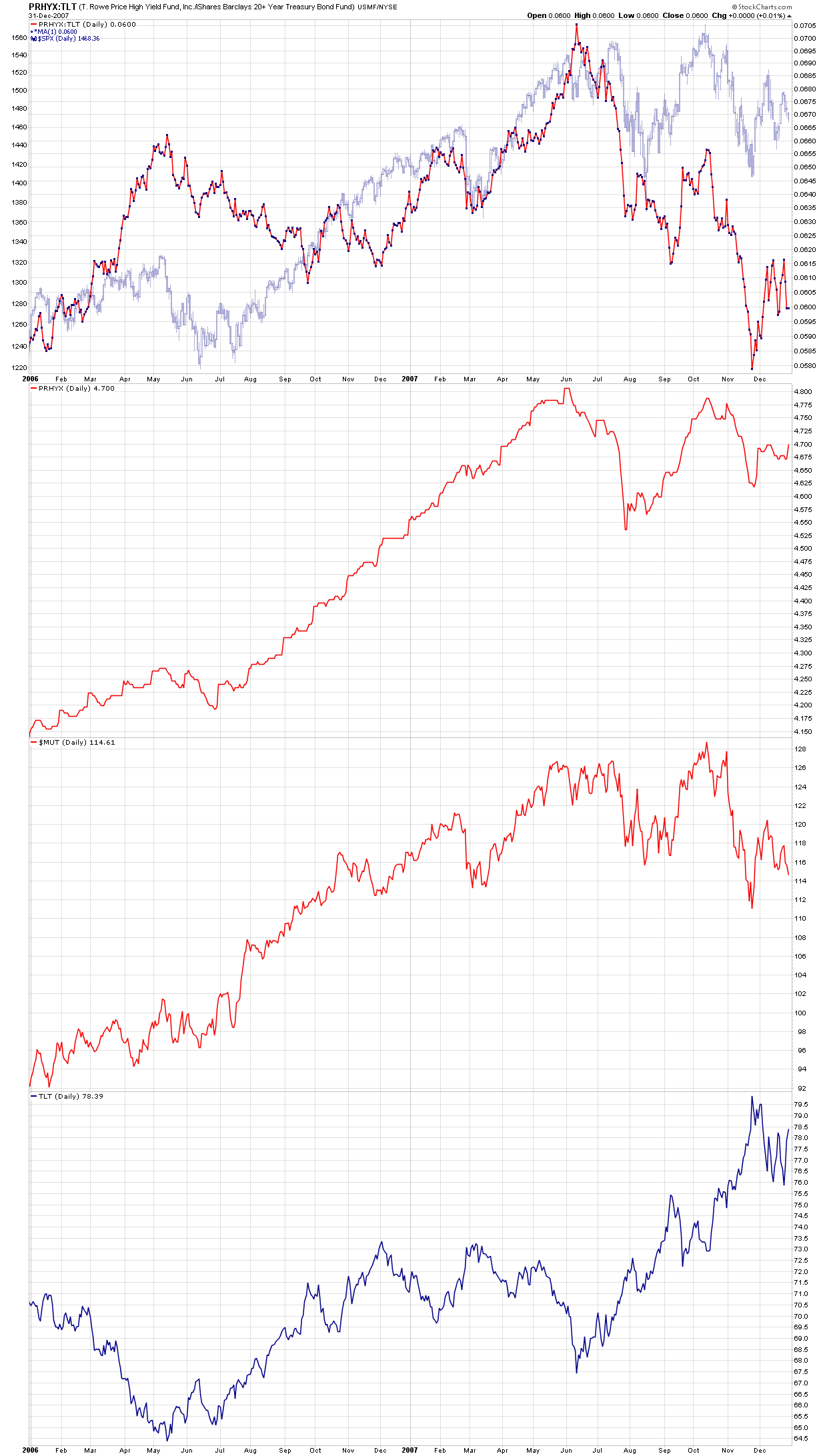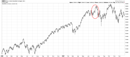 And here is the same chart as above except it’s for 2006 through 2007. This index peaked in early June 2007 and declined steadily after that. The October 2007 price peak was unconfirmed by this index. Compare this chart with the one above.