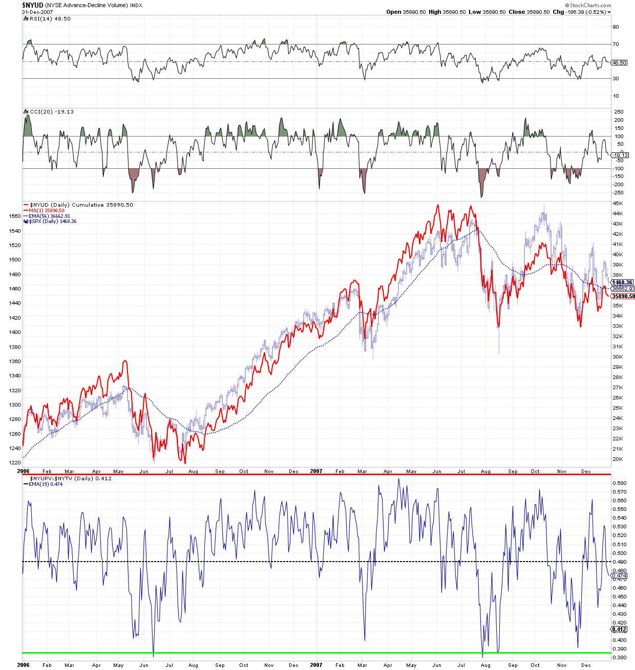 The following is the same up down cumulative volume line except the time frame is 2006 through 2007. As you can see this index peaked multiple times from early June to mid-July 2007. It was well off it’s peak on the October 2007 rally indicating that there was a problem. Compare this chart with one above.