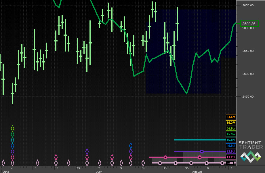 The situation is the same in the Nasdaq, and so let’s take a look at something else of interest: the interplay between price and the 20-week FLD. I mention above that the peak of the current 40-week cycle in US markets is expected in the first 20-week cycle, and we will know that peak has occurred when price crosses below the 20-week FLD. Here is that FLD. Note how price traveled along the FLD in early July, and then bounced off the FLD this week on Wednesday.