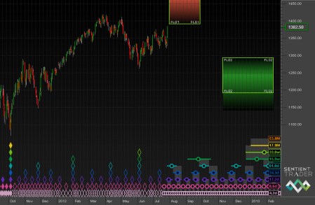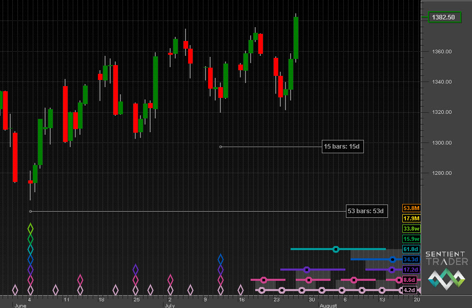 That is all very well, but what if you have a cycle that is 51 days long and another cycle that is 52 days long? Is the former a 40-day cycle, and the latter an 80-day cycle? There is only a one day difference between them, and so it is surely absurd to be so “black-and-white” about it! Yes indeed, and Sentient Trader isn’t so “black-and-white” about it, it uses a form of fuzzy logic to resolve these situations, which includes looking at the shorter cycles and how they have formed.