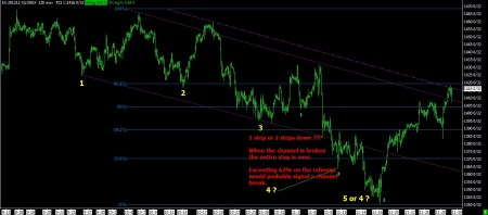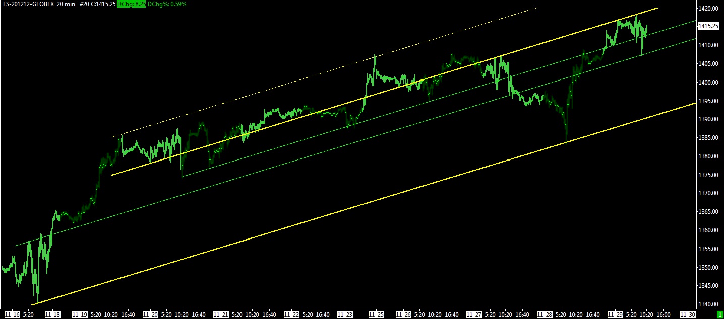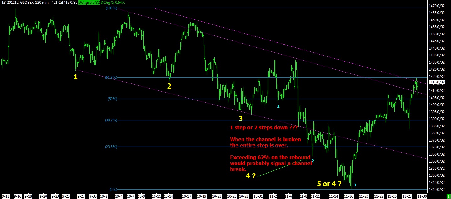 11:02 PST – A well defined upward channel in the first chart. In the 2nd chart, we are approaching the upper boundary of the down sloping channel in force since 9/16/12.