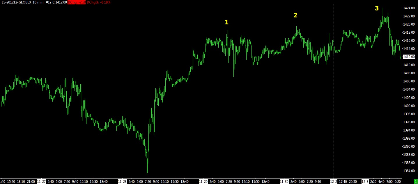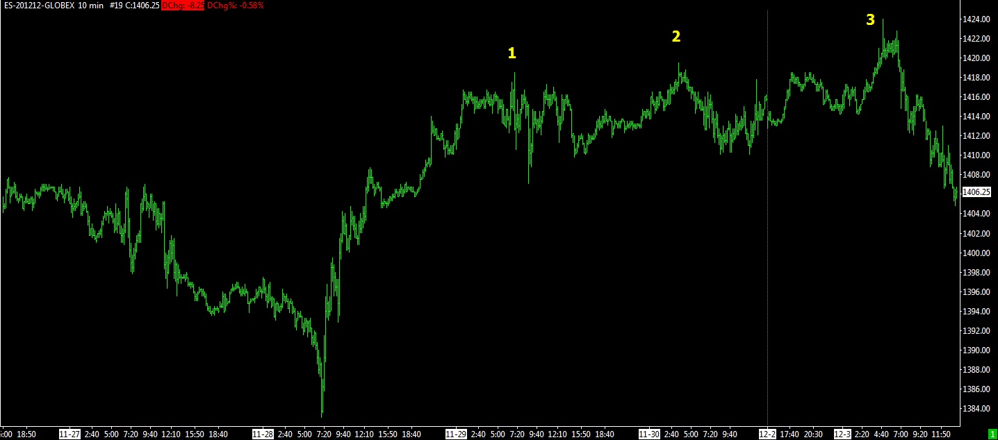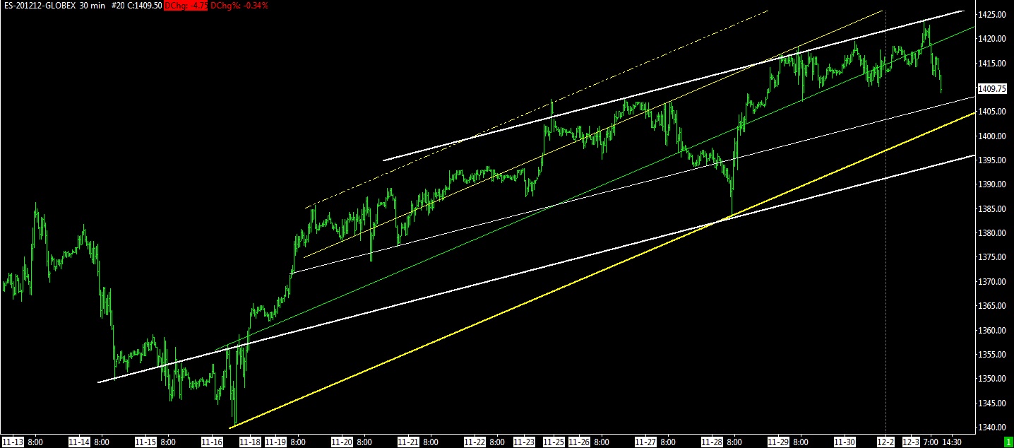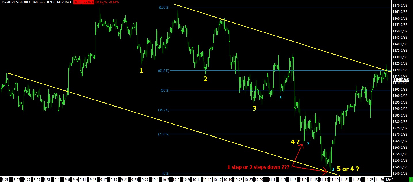 10:20 PST – It appears that we may have finished a step up this morning, counting from 11/28/12 (I count 3 steps on the chart). Was this the end of the significant 3 steps up since 11/16 or only 2 steps up? Until we take out a significant prior low and break the uptrend channel, it’s usually considered to be a correction and not a reversal of the 11/16 bottom (unless you want to gamble – been there done that many, many times).