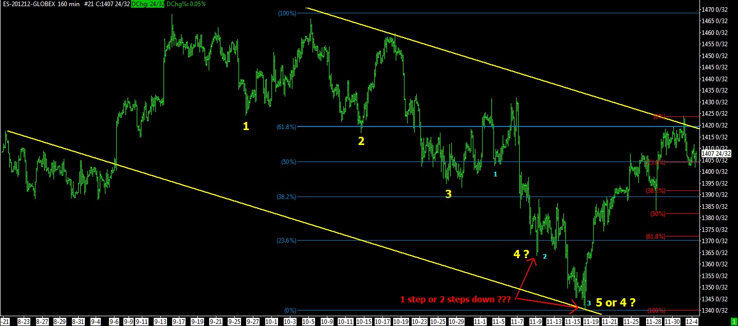 12:43 – PST – The correction beginning yesterday has halted at the 50% retracement of the entire decline since 9/14/12. It is also at the 23.6% retracement of the rally since 11/16/12. See chart below.