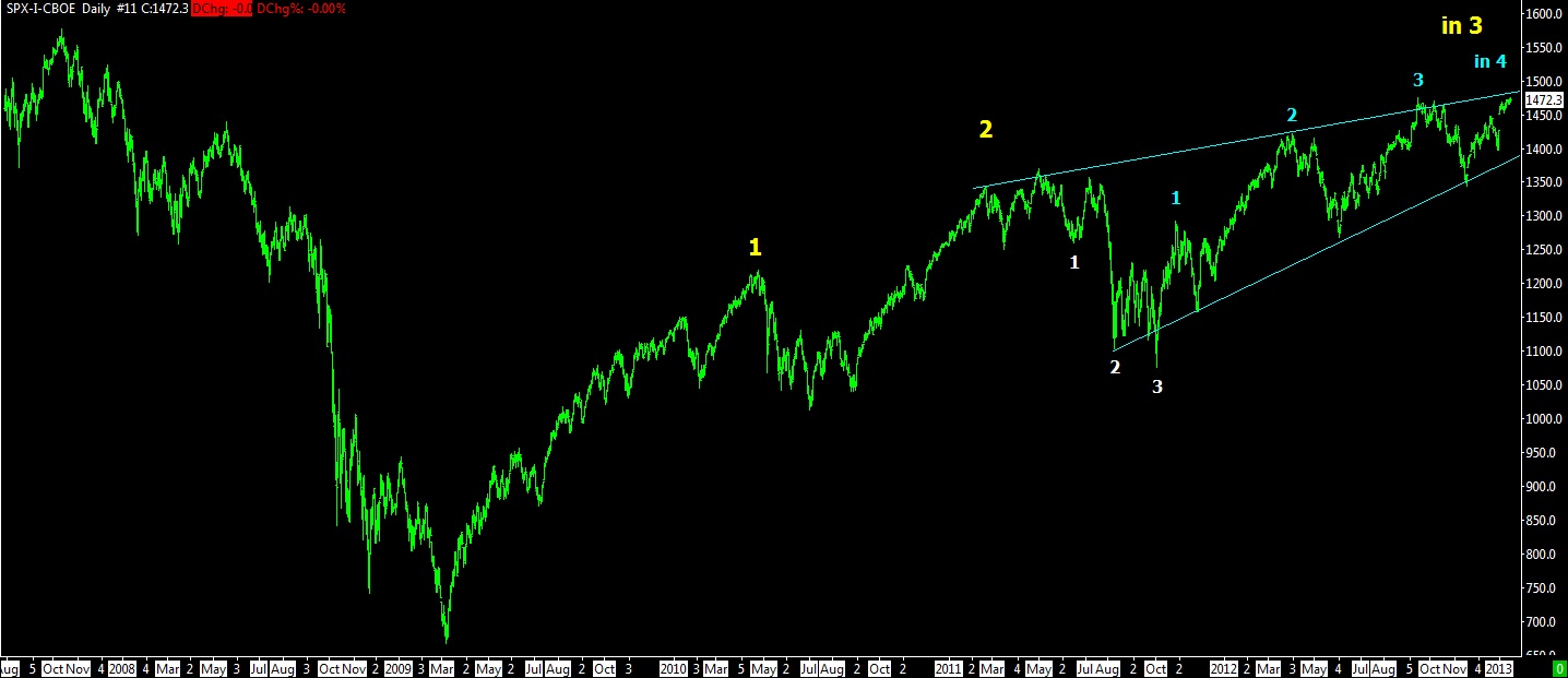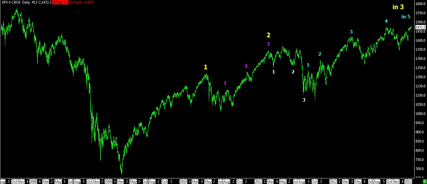 This next chart is a bit unconventional because of the wave count during the correction in the first half of 2011. Notice that I have labeled step 1 down (white), which is followed by a higher high. The end result is that this chart starts the 5 steps up (blue) at an earlier date than the first chart. The end result is that this chart shows us currently in step 5 (blue), while the first chart shows us in step 4 up (blue).