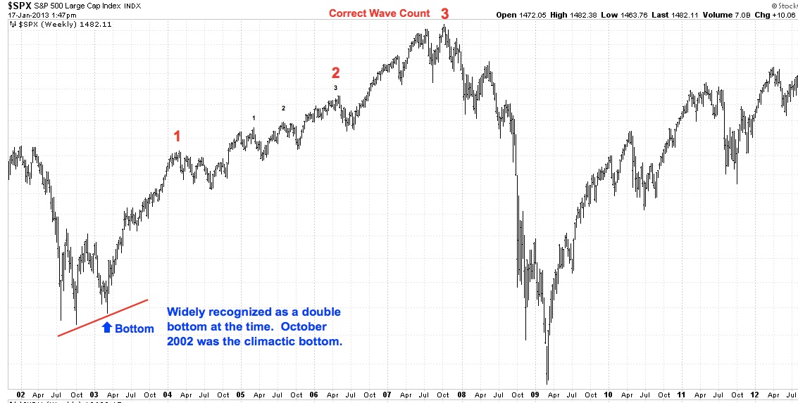 Look at the next chart and you can see how easily I made the mistake on the wave count in 2007. I was well aware of the fact that I could be making a mistake in 2006 because I was bothered by the fact that the March 2003 bottom was considered to be THE bottom and not October 2002. But March 2003 was a higher low in a LOT of indexes and I therefore initially went with the October 2002 bottom.