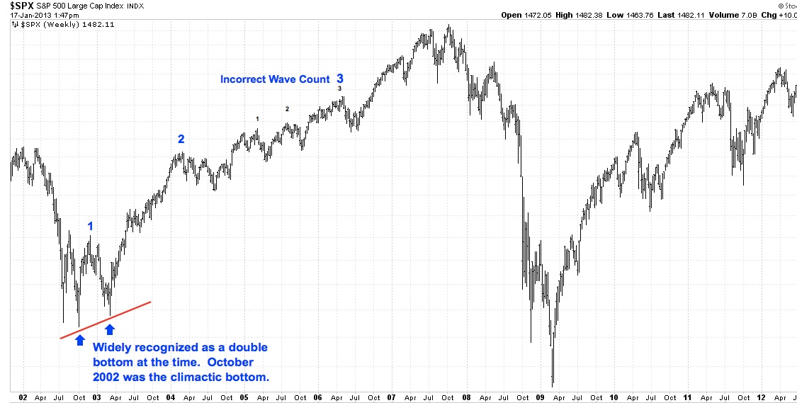 I was troubled by the wave count in 2011 and decided that the wave count in the second chart was correct. The surprise that followed was the October 2011 plunge.