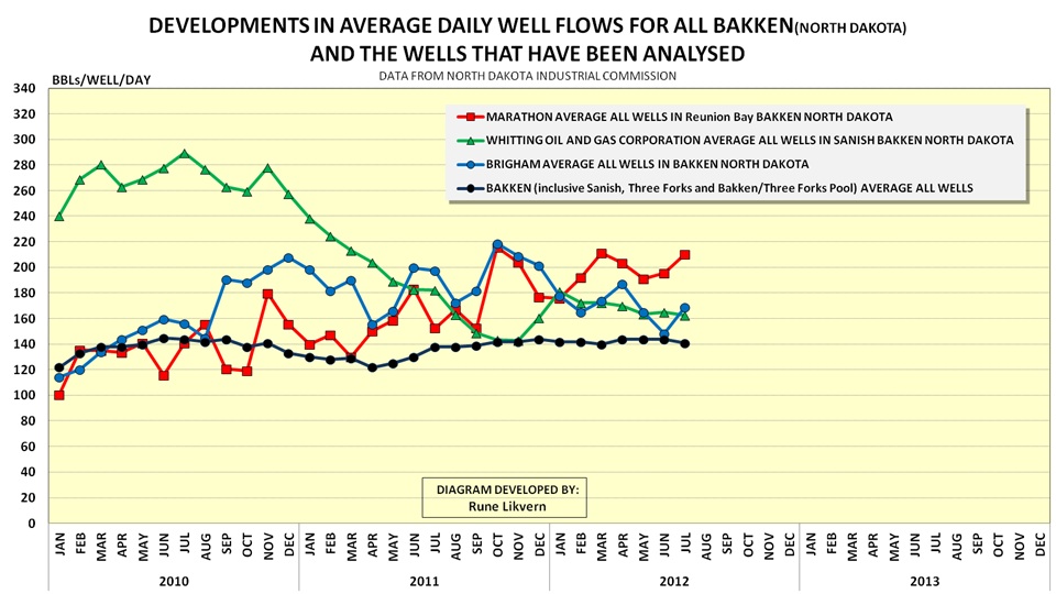 Figure 06: The chart above shows the development in specific average productivity (Bbls/day/well) for all Bakken in North Dakota (black circles connected by black line), Whitting Oil and Gas Corporation’s wells in Sanish (green triangles connected by green line), all of Brigham’s wells (blue circles connected by blue line) and Marathon’s wells in Reunion Bay (red squares connected by red line) from January 2010 and as of July 2012.