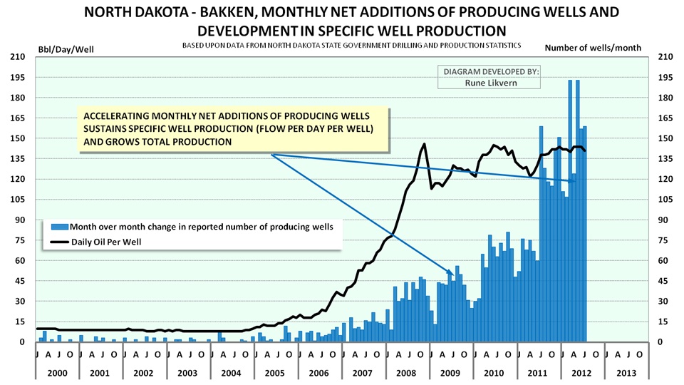 Figure 04: The chart above shows the development in the reported net total monthly start up of wells (blue columns) and the development in the specific productivity (Bbls/day/well; black line) for the Bakken formation from January 2001 and as of July 2012.
