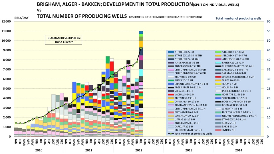 Figure 09: The chart above shows development in total production by individual wells (ref the legend) and total number of reported wells with production for all Statoil/Brigham wells in the Alger area of Bakken.