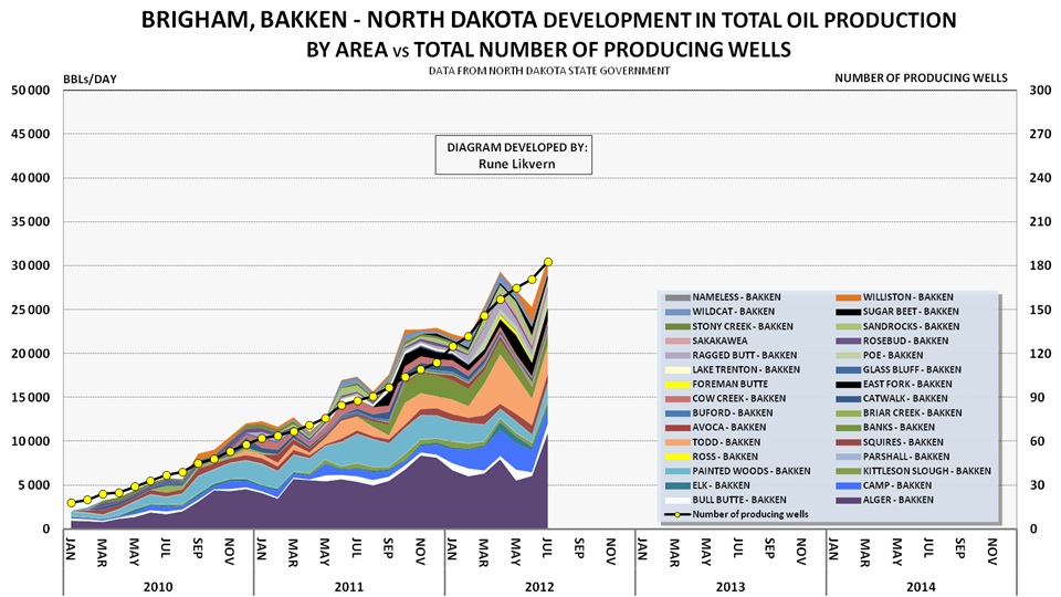 Figure 08: The chart above shows the development in reported total production by area for all the wells for Statoil/Brigham in the Bakken formation, North Dakota. The chart also shows the development of total number of wells. The chart spans January 2010 through July 2012.