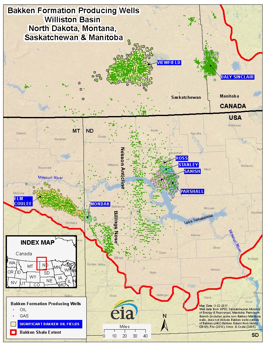 Figure 02: The map above from EIA (Energy Information Administration) shows the extent of the Bakken formation, areas with considerable activity and oil and natural gas wells. The most active areas are also the most productive ones (sweetest spots) and data now shows that these are well developed (saturated).