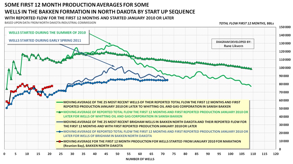Figure 14: In the chart above the same methodology as used for figure 13 is shown for the companies/areas covered by this study. The green triangles connected by green line are the moving average for Whitting Oil and Gas Corporation’s wells in Sanish. The green line shows the 25 moving average. The blue circles connected with a blue line are for the wells of Statoil/Brigham. The dark blue line is the 25 moving average. The red squares connected by a black line are for Marathon’s wells in Reunion Bay.