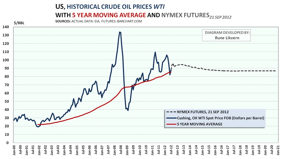 Figure 17: The chart above shows the development in the oil price, WTI, as from January 2000 and now. Further the NYMEX futures (WTI) as of 21 September 2012 through December 2020 have been added. FWIIW the 5 year moving average of the actual WTI has been added (red line).