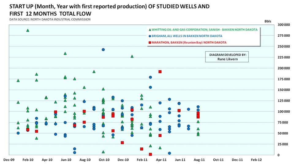 The chart above illustrates that there is a huge spread in well productivity, cumulative and decline rates amongst individual wells. The well Sorenson 29-32 2-H (blue line) got attention from, amongst others, the Oil&Gas Financial Journal back in April 2011. Normally it is the exceptionally good wells that get the attention of media and its readers.