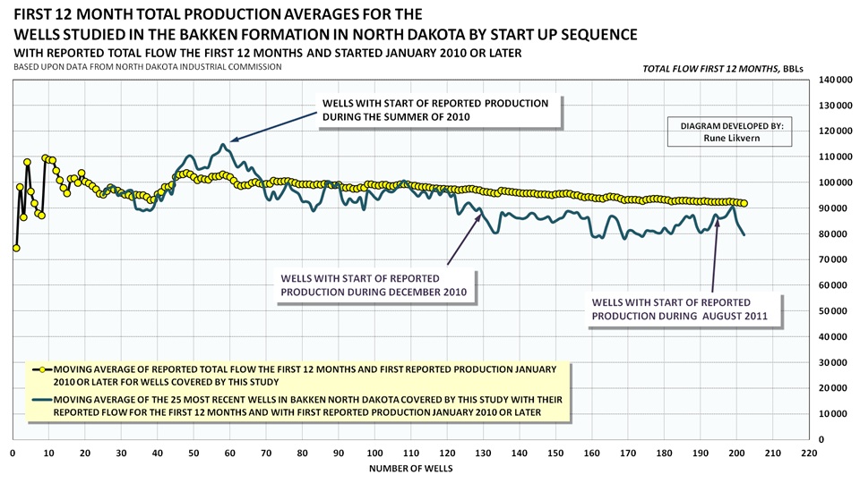 The in-depth time series study was comprised of 478 wells (around 11%) of the 4 319 wells reporting production from the Bakken. These wells represent around 13% of the total production as of July 2012. The wells with reported start of production as of January 2010 and later and that had reported production for 12 months or more were subject to additional analysis which includes the wells with reported start of flow as of August 2011. In the period January 2010 and through August 2011 there was reported start of flow from a net addition of 1 417 wells of which 202 (or more than 14%) were subject to extensive statistical analysis. The statistical analysis formed the basis to define what is presently considered a pro forma well (or “average” well) for Bakken. The “average” (pro forma) well should not be expected to be static as it will continually change with time and presently the trend is one of declining productivity.