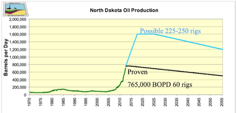 Figure 1. Achieved and projected North Dakota production when 170 rigs are used to continue to develop the field into the foreseeable future. (ND DMR).