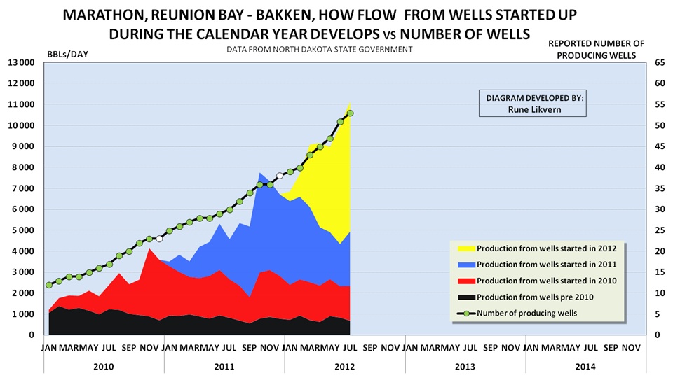 Figure 10: The chart above shows development in total production by individual wells (ref the legend) and total number of reported wells with production for all Marathon wells in the Reunion Bay area of Bakken.
