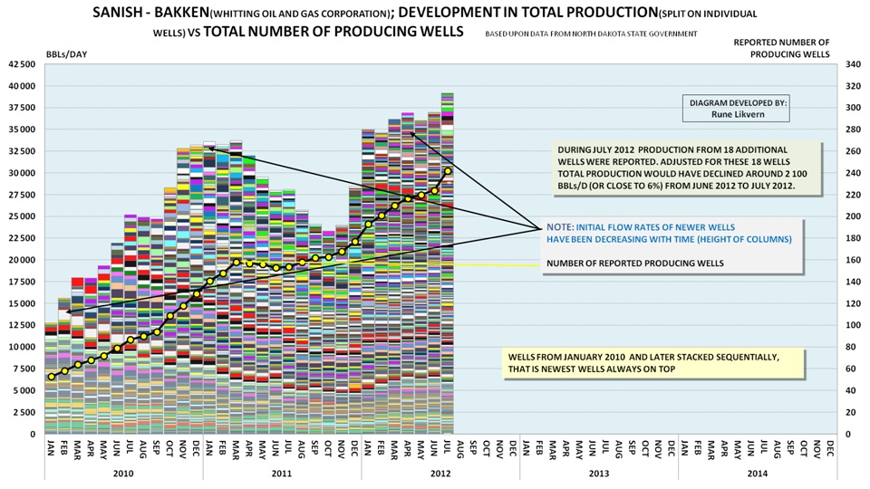 Figure 07: The chart above shows the monthly total number of wells, month of start up of reported production from added wells, production from the individual wells and total production from the 242 wells reported for Whitting Oil and Gas Corporation in Sanish – Bakken as of July 2012. The chart spans the period January 2010 through July 2012. The wells in the chart are stacked sequentially according to reported start up of production that is newest wells always on top.