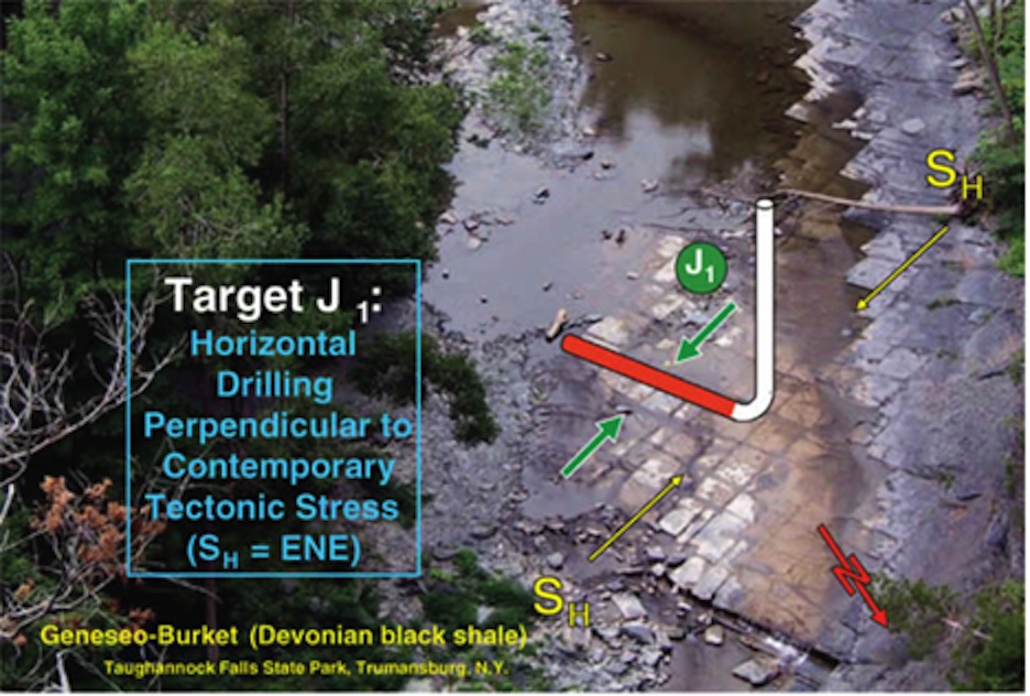 Figure 4. Representation of a horizontal well drilled in the Marcellus, shown against the natural fracture pattern (Source AAPG)