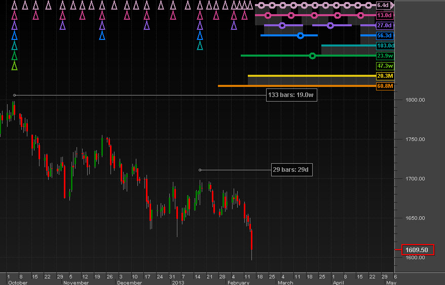 Here the 80-day cycle trough is looking more like a hidden trough on the downside, indicating that the bearish move has only just started.