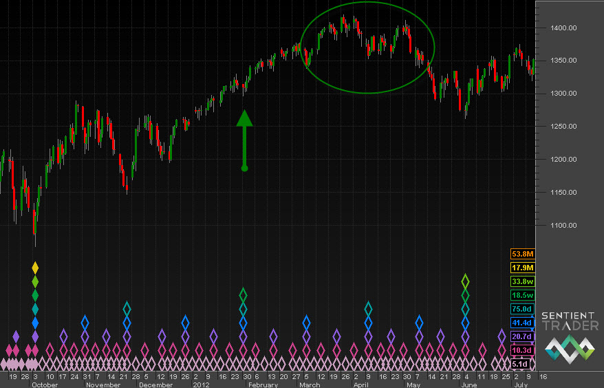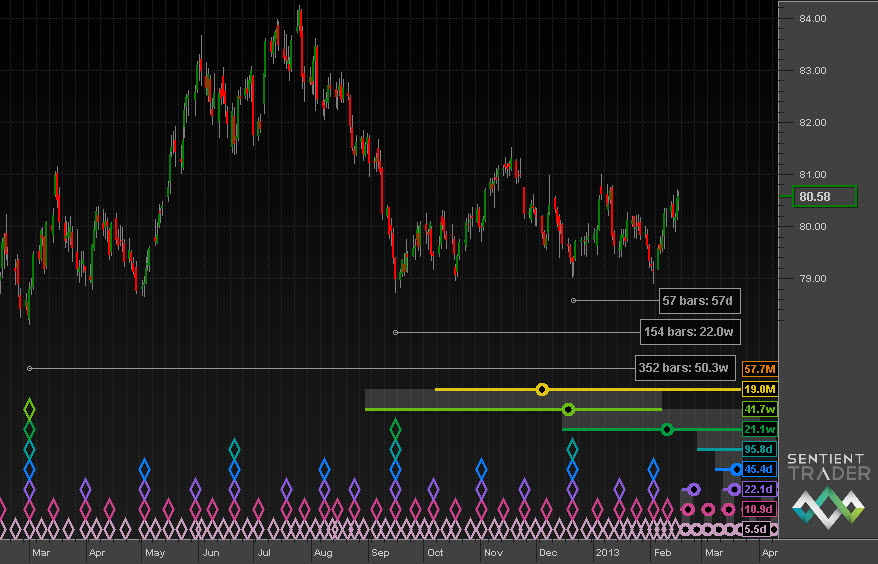 The dominant cycle is the 40-week cycle. Note the hidden trough of the 20-week cycle marked with a green arrow, and the straddled trough of the 80-day cycle with the fairly symmetrical price action surrounding the trough highlighted with a green ellipse.