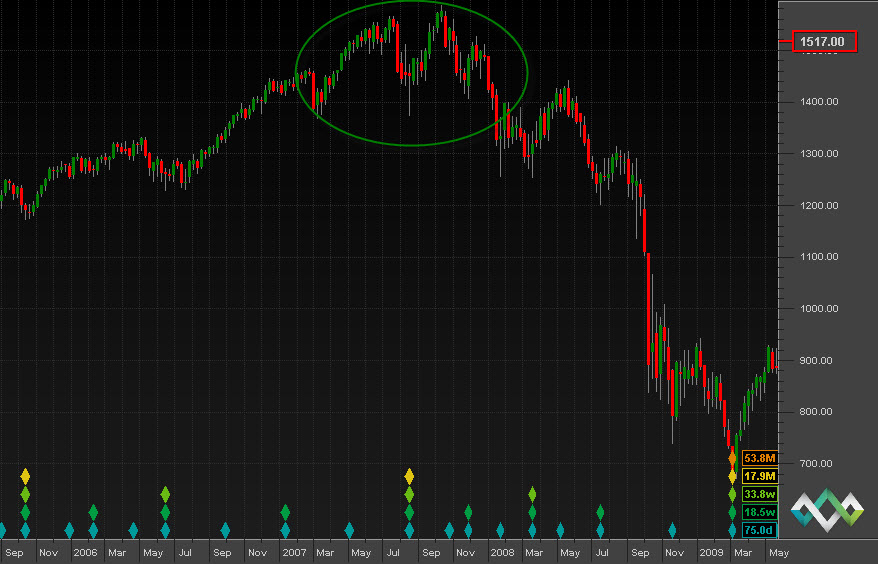 The green ellipse highlights the symmetrical price move surrounding the straddled 18-month (at least) trough of August 2007.