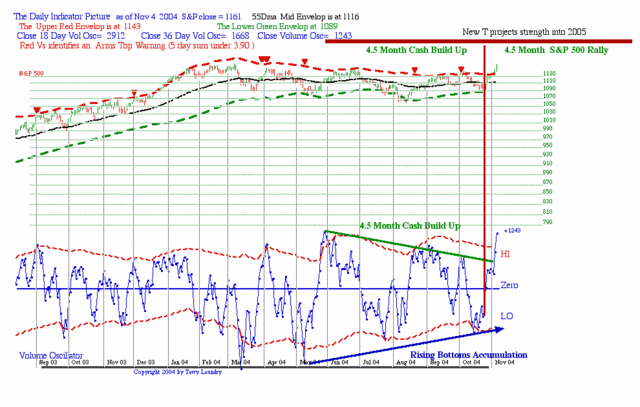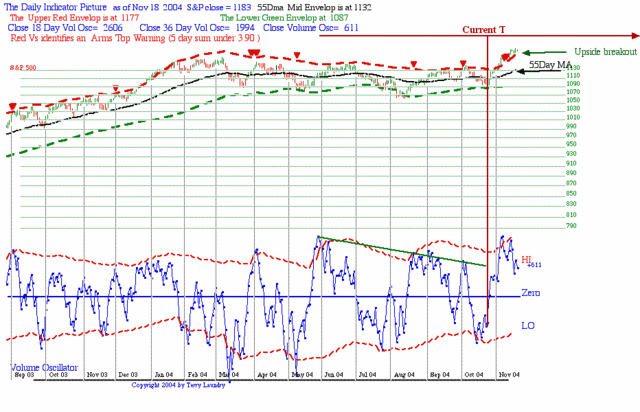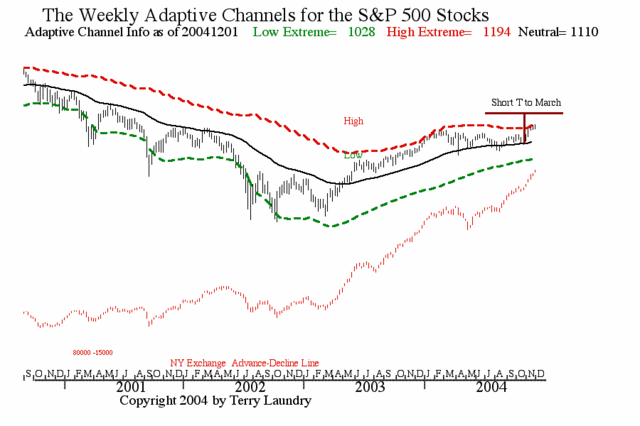 As per my earlier comment, the real power of any rally starting from the center of a new is usually crammed into the first few weeks. Thus the new uptrend needs to establish its longer-term momentum during the November period if the rally is going to develop meaningful investment potential into mid 2005. I expect this will be the case but the only way to demonstrate strength is to punch the S&P through the adaptive channel upper bound noted by the red dashed line.