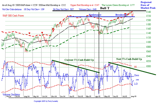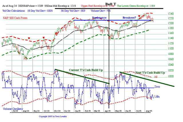 The market is still absorbing the big oil price rise in a negative way. Currently the volume oscillator is oversold and I am awaiting a bottom pattern which should set the stage for the current T’s final rally into September. Once this rally is complete the market should correct into the center post of the next T (in the Fall) using the new cash build up noted in my last week’s chart. Lightening up on the next rally would make sense depending on what we see for the final rally.