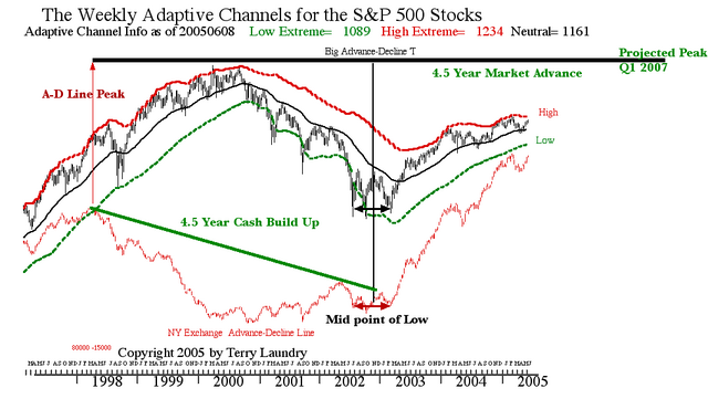 The chart above is from my 1990’s studies. It illustrates the reliability of the A-D T projections of market peaks in the NY Index using the green cash build up periods in the A-D plot at the bottom of the chart. As usual, the green decline time in the A-D Line defines the left side of the T and the equal time projection for the NY Index rally phase generally does a good job of projecting the time of the next peak. Note T#2 projects a very long (6 years) rise in the market and is correct in identifying the 1980 peak. Also note the suggestion of a 8 year cycle in the raw Advance-Decline Line.