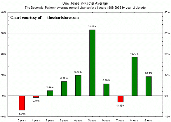 This decennial (10 year) pattern concept is frequently at odds with the simpler 4 year cyclical interpretation and often points to unexpected shifts that catch most investors off guard. Amongst old pros the decennial pattern is valued for its independent and generally reliable leanings as to whether any new year within the decade pattern might be good or bad. The pattern was discovered by Edward Dewey, a pioneer in cycle theory and founder of the Foundation for the Study of Cycles, but is somewhat mystical in its claims that stock market patterns of good years, bad years, etc. is dependent on the rather arbitrary last digit in the year. That is, best performing years are those who end in the year “5” while bad years for stocks are likely in years that end in “0” based on statistics from 1895. Thus 2000 was a bad year because it ended in the number zero while this year, 2005 has historically the best upside potential.