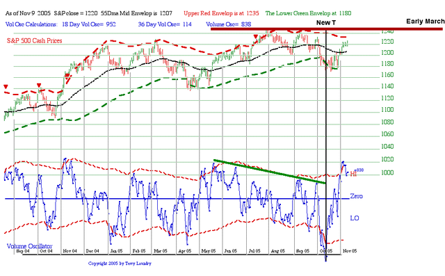 Of course the matter must be resolved soon. Conventional T Theory says the rally from the oversold condition will run into resistance at the 55 day MA, which has been true. But today the S&P got up to 1215 which probably typical for the initial rally of a new T. The Volume oscillator has broken out so we know a new Short range T has been defined time wise.