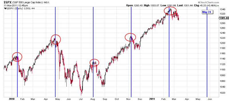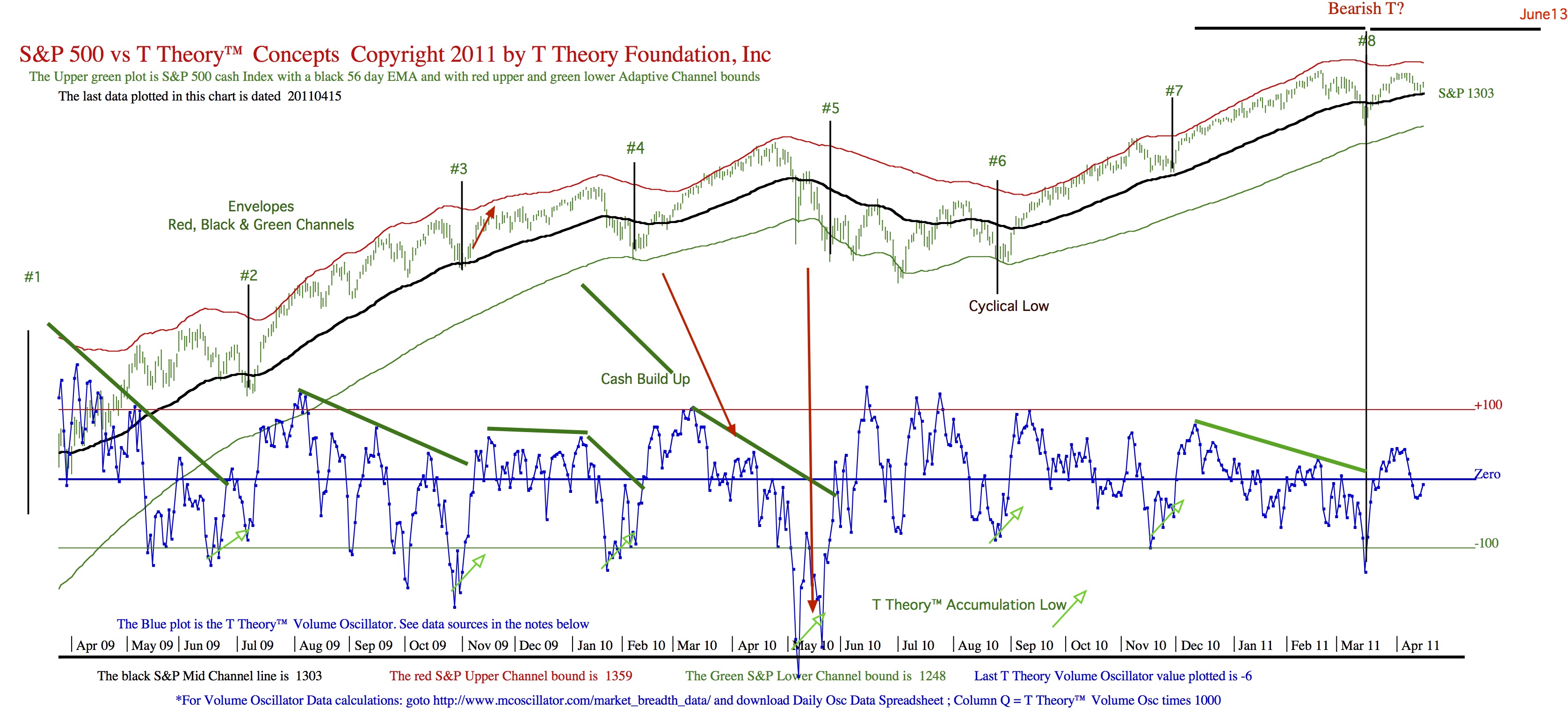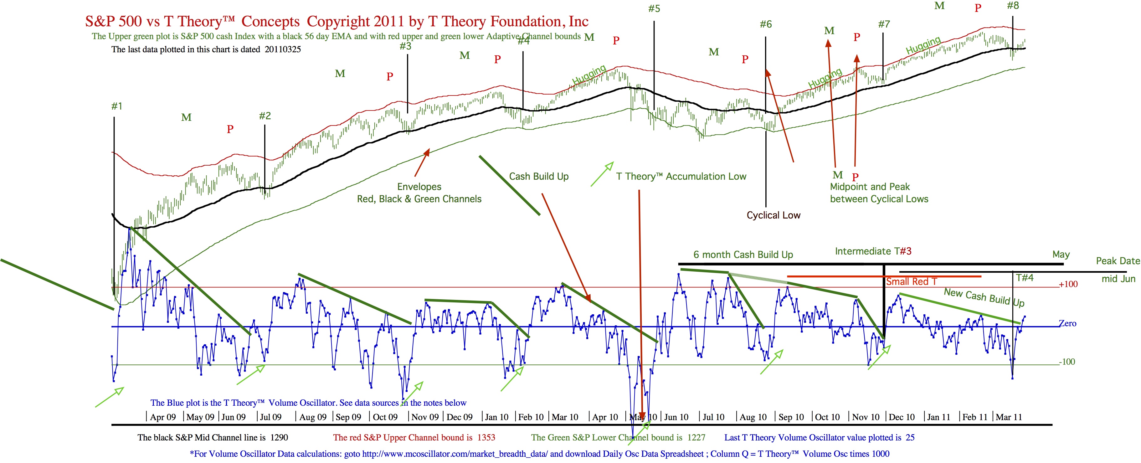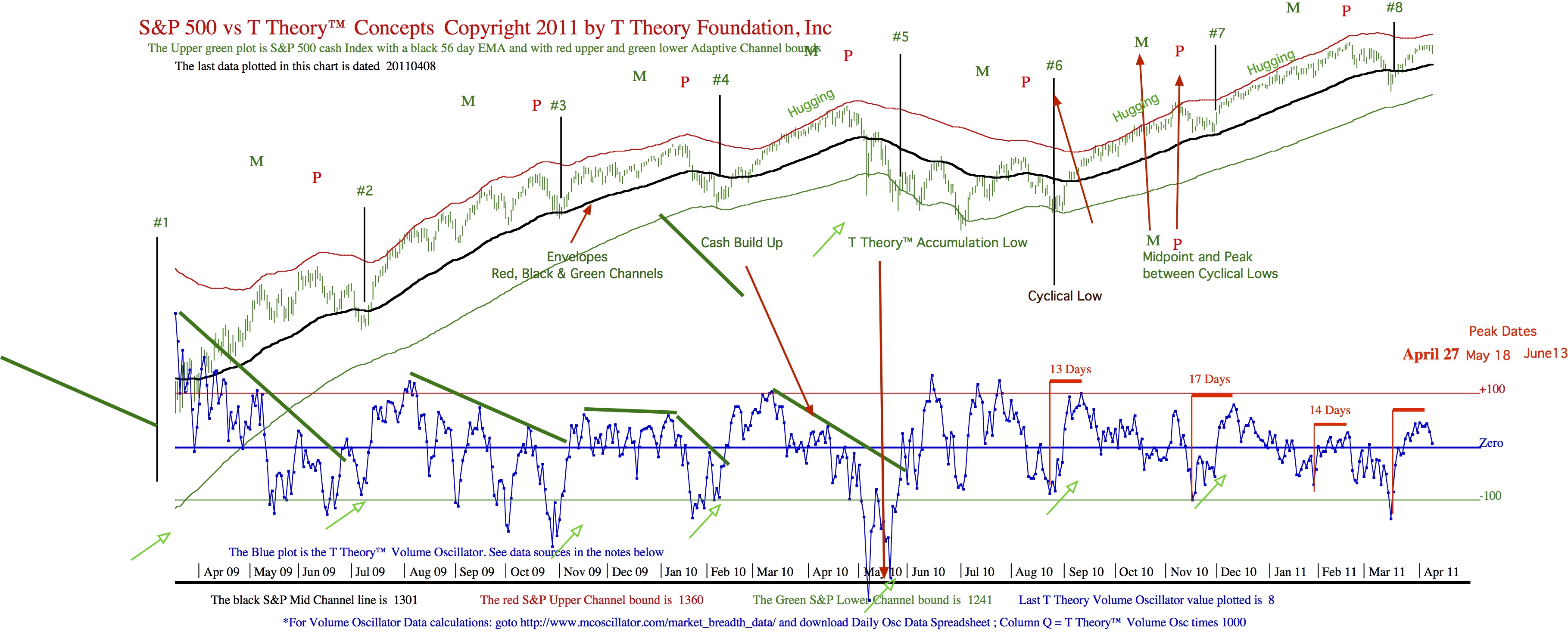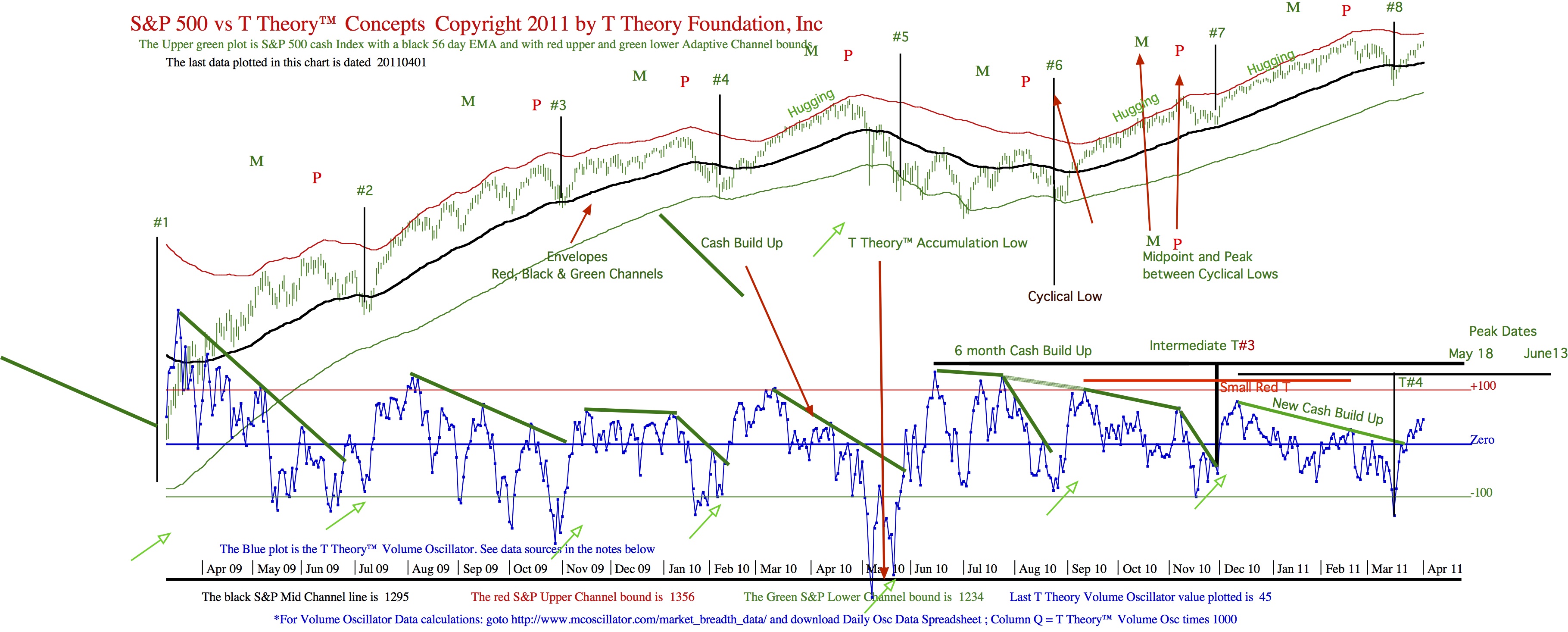 Comment from Jeffery: Charles (Nenner) thinks we are making a major top over the next month or two as we do in T Theory. He is not calling for it to fall apart but erode through the rest of 2011 or stay neutral give or take. He expects that by late 2012 early 2013 that things will begin to deteriorate over the next 2-3 years wind up falling dramatically (Dow 5000) is the price target but not until around 2016. He expects markets will not recover until 2020. These are based on longer term cycles. In reality I think they are likely influenced by some of the same things T Theory looks at.