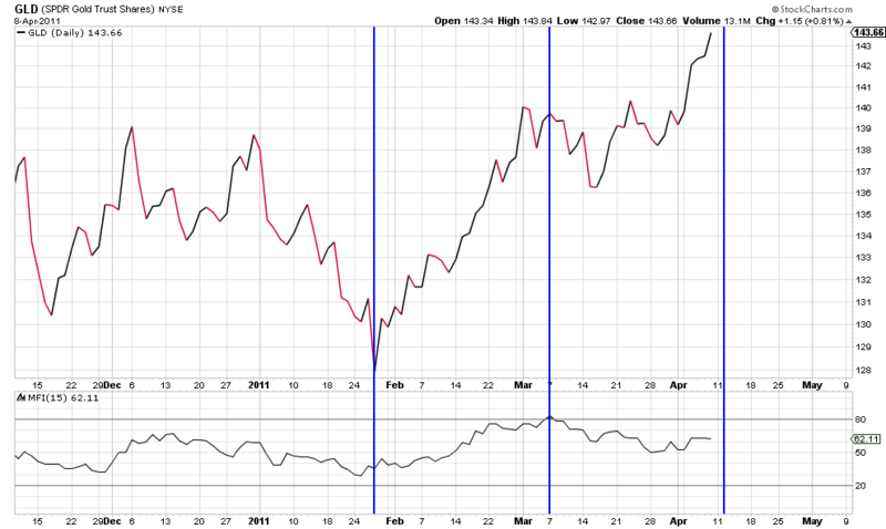 The weekly GLD Money Flow T™ using an 11-period MFI expires in mid-June.