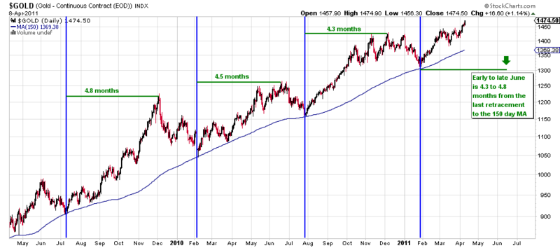 Finally, my friend Diogtenes has alerted me to a very interesting cycle in gold.  Over the last two years, the 150-day moving average has served as rock solid support.  Further, every time gold retraces back to the 150-day moving average, it makes a major peak roughly 4.5 months later.  If it follows the same pattern, we should expect a major peak in June.