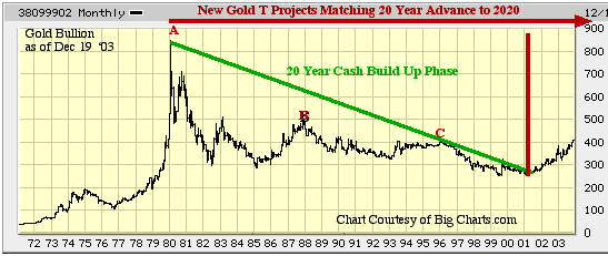 Thus it can be assumed the recent rising trend will continue until Gold can convincingly break above the C peak at $420-ish. This might require a burst of strength to $450 or better to confirm the basic T criteria. Expecting Gold to climb above the 1996 peak, probably in the early part of 2004, is the single most important short-term conclusion to come out of this long-term analysis. In the meantime it is not unusual to see hesitation or dips as preparation to the upside breakout, but they can be bought ahead of the expected breakout.