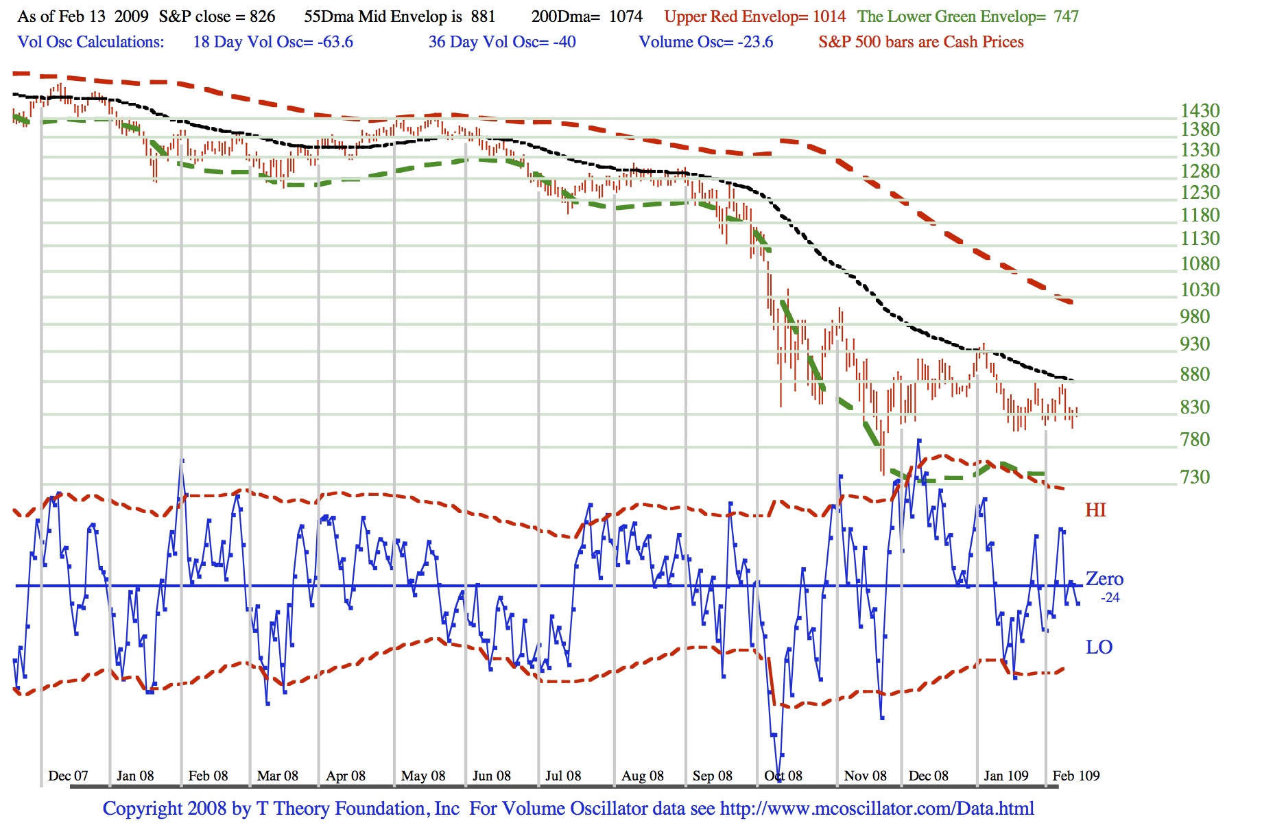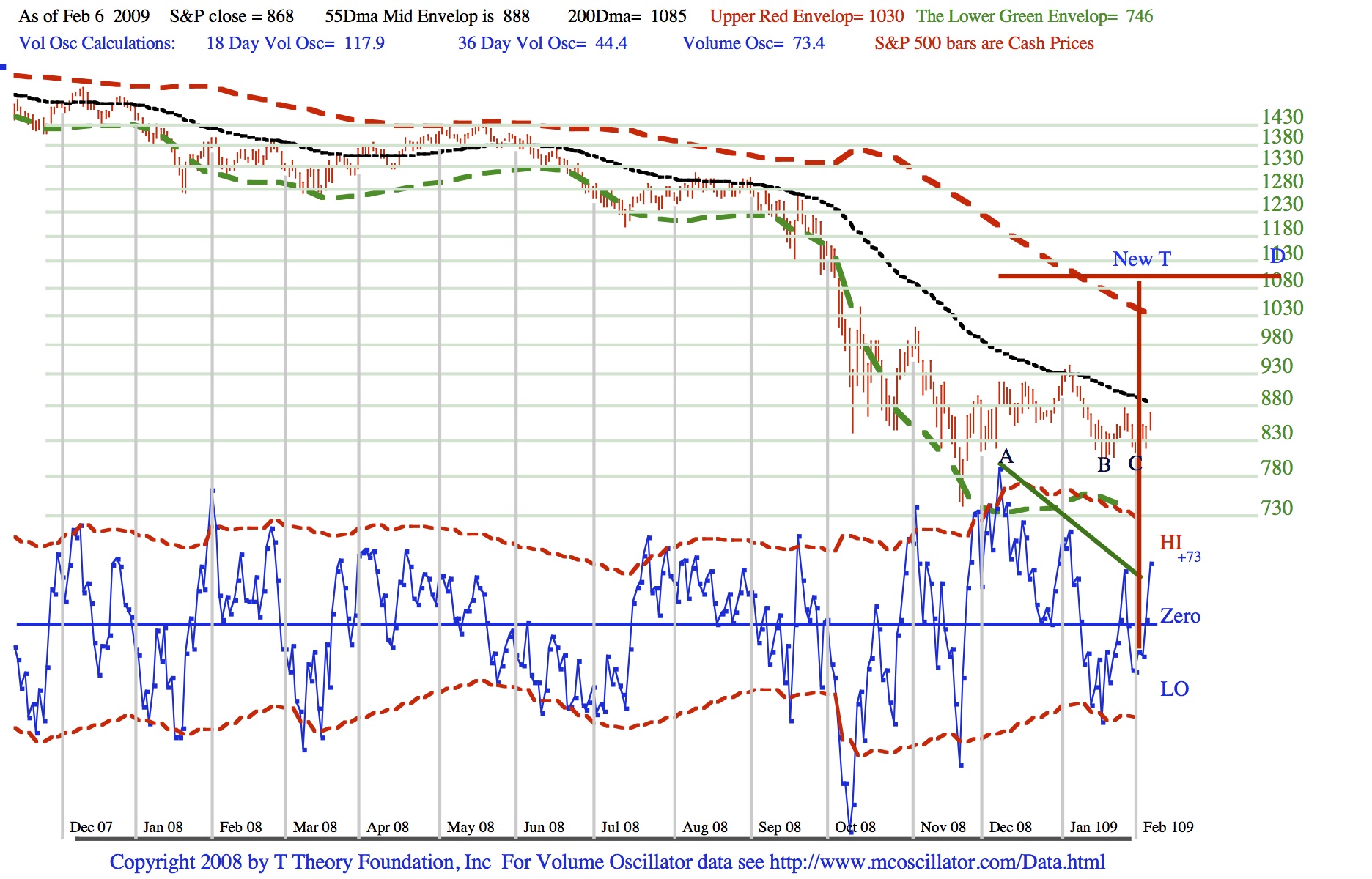 Update for Monday February 9 2009. (Update is completed) Listen to the topics below by clicking on the Audio links after you have had a chance to review today’s Chart link and Referenced article from the 2005 archives. Here we see the new Short Term T that will produce a bear market rally into mid March.