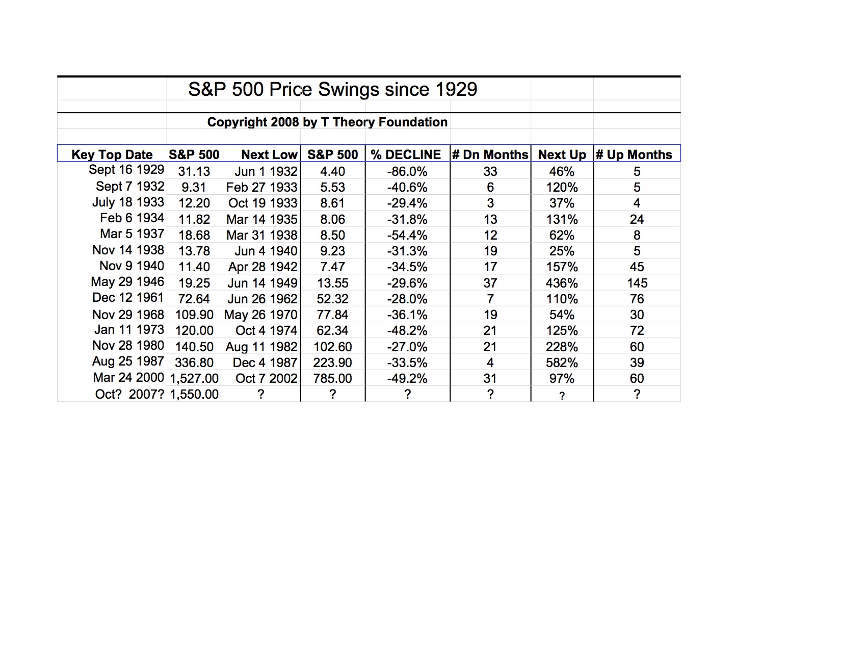 So as we start January 2008 I have posted below my first long term table showing the summary of major swings in the S&P 500 benchmark since the 1929 peak. You may download this table in PDF format and consider some of its long term conclusions. The data is being reviewed for accuracy but I don’t believe there are any serious errors.
