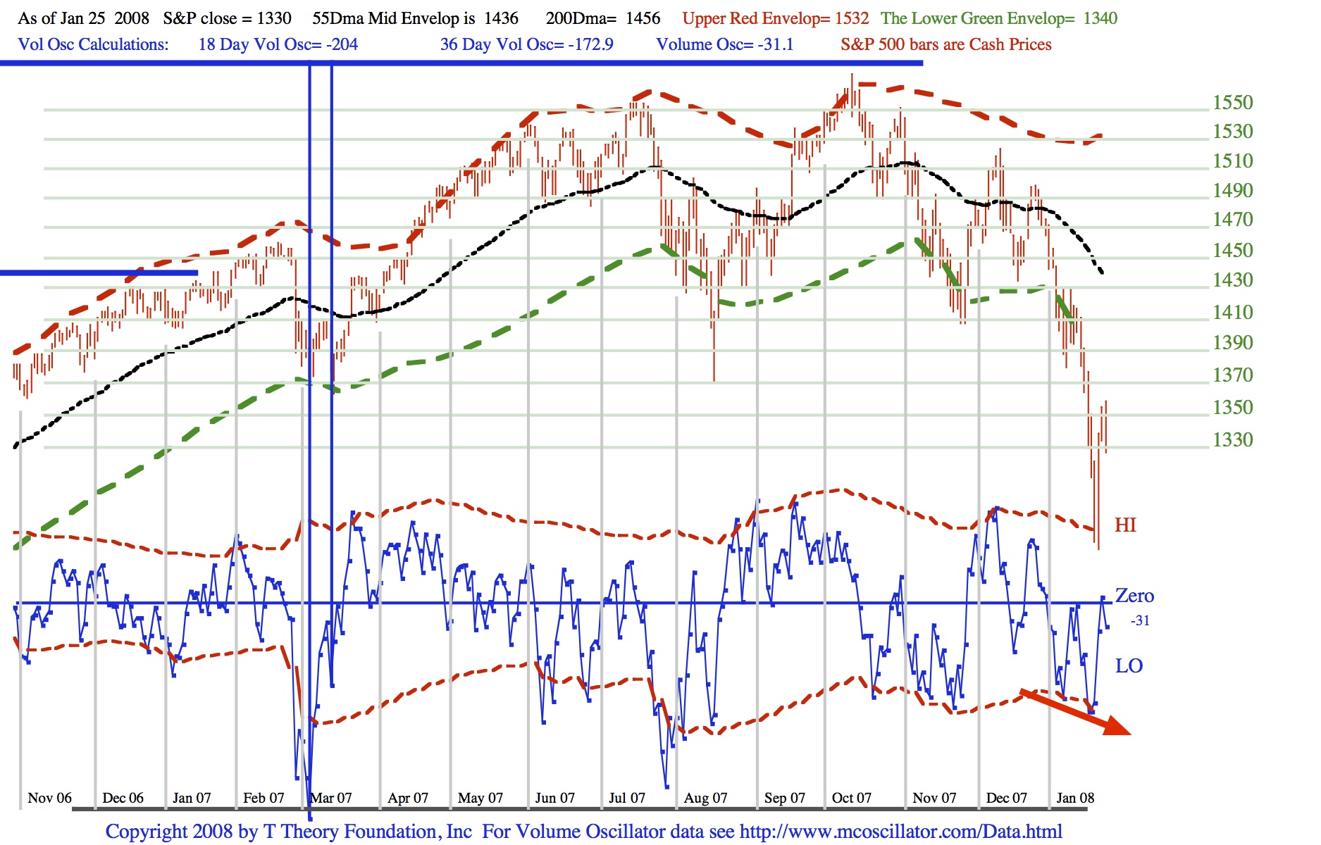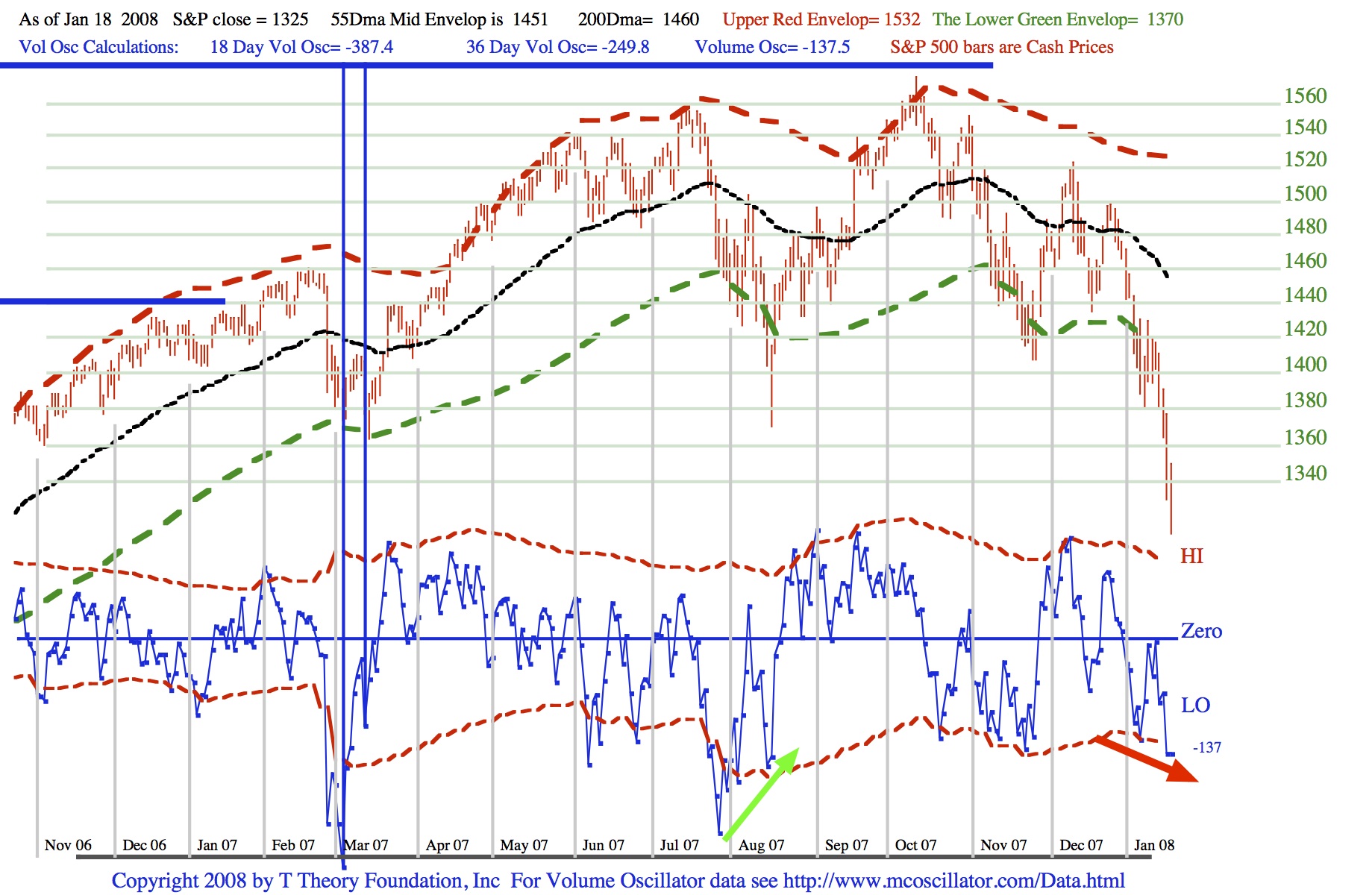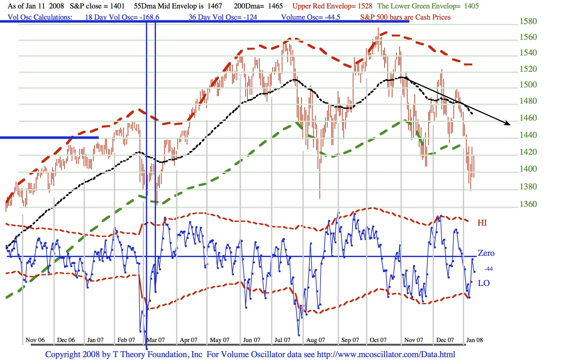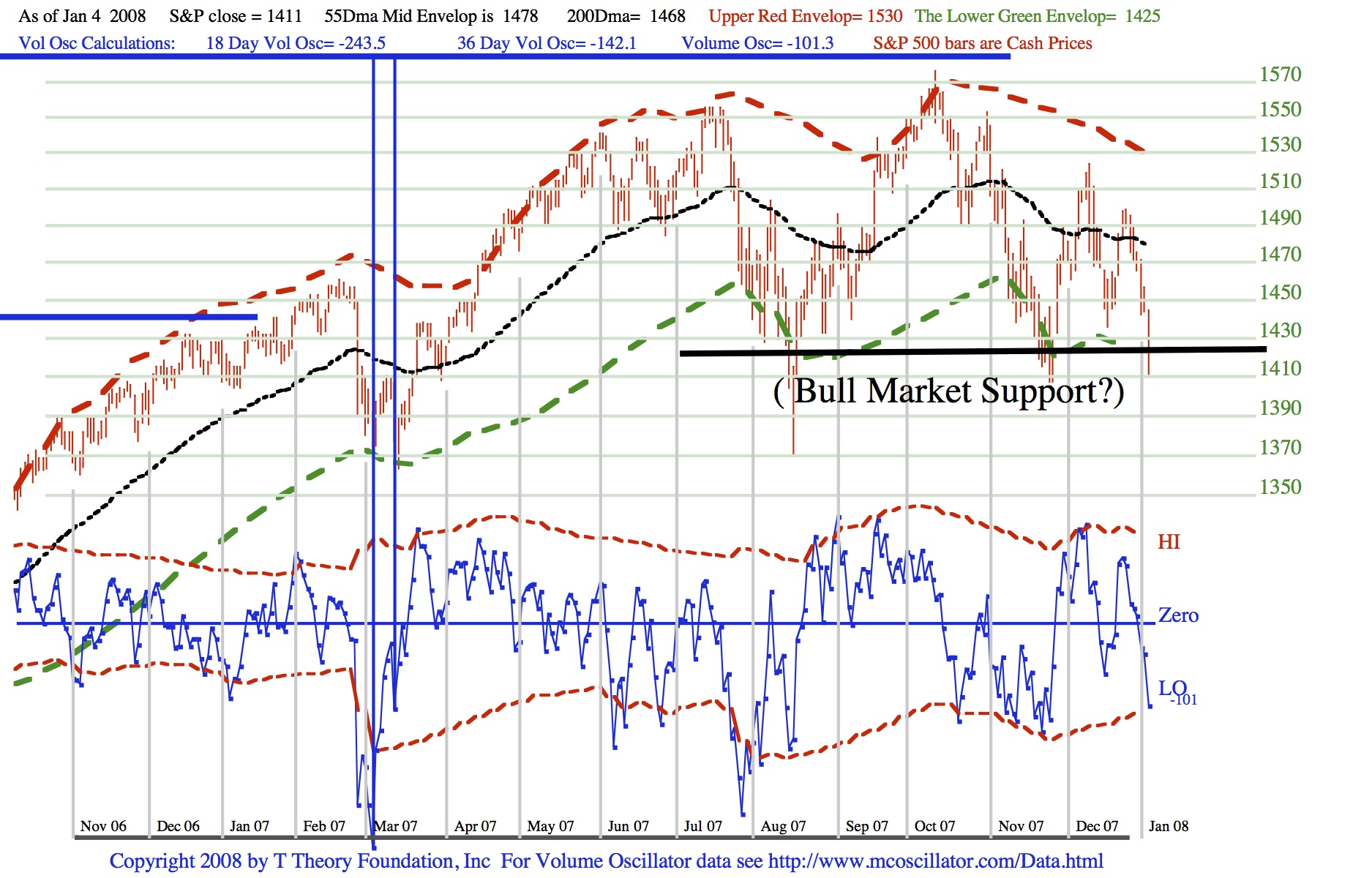 It is possible for a further rally to get under way near term but I would be wary that all we will see is a sideways trend followed by a new very sharp selling wave. Note that the oscillator went very low at the center-post of the last T in March ‘07. Since we have seen no such comparable conditions, the safest conclusion is the usual selling climax that marks a new Ts bottoming, lies ahead.