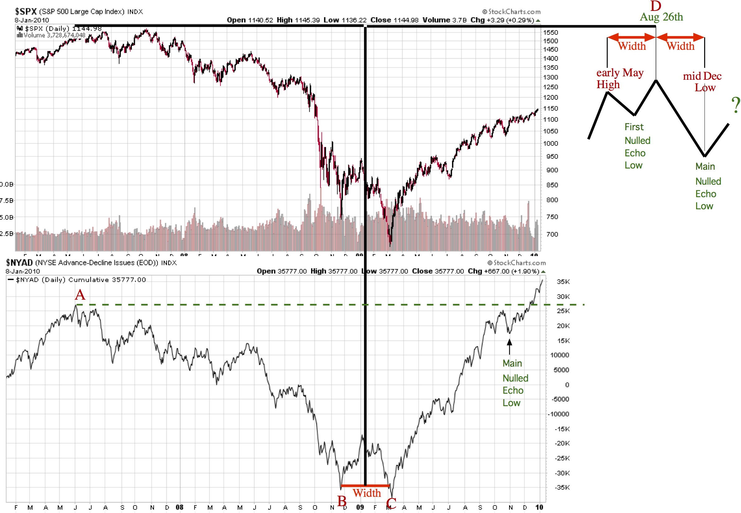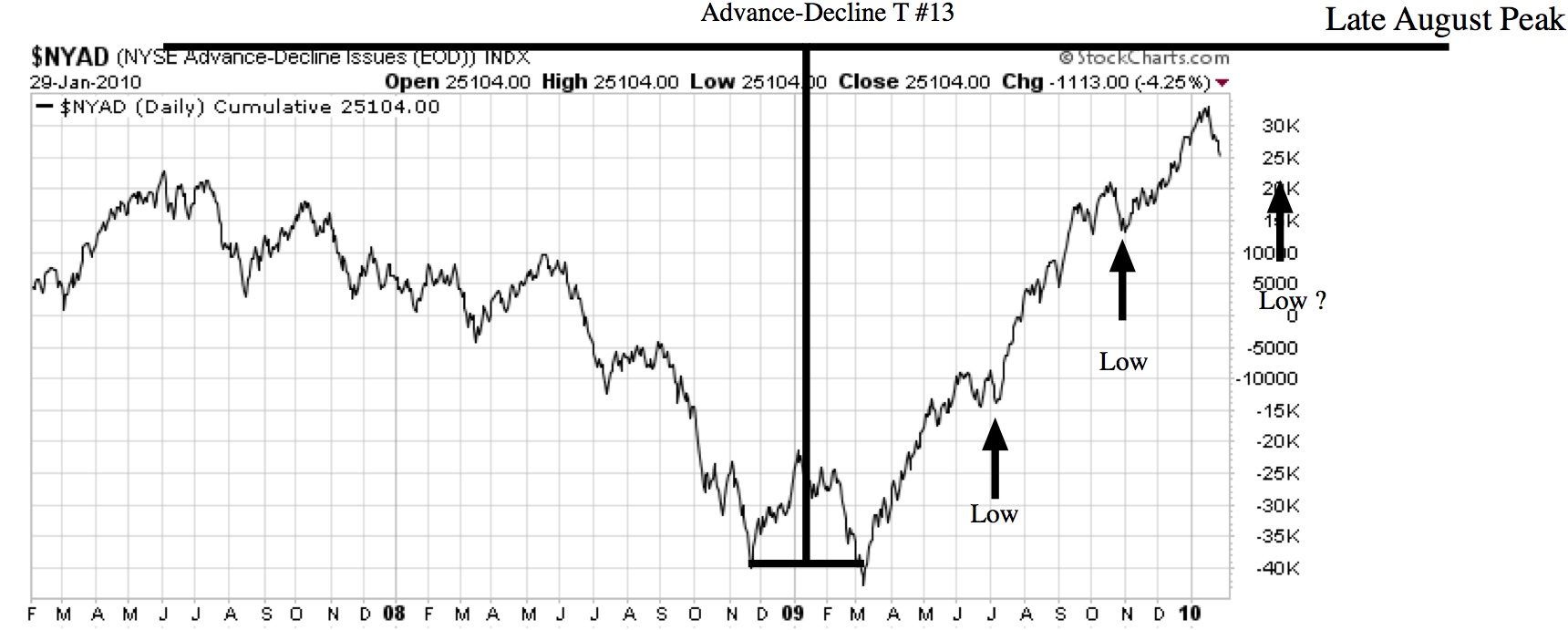 Happy New Year. This week and next week I will be spending most of my time updating the year-end data at American Shareholders OnLineOur Managed accounts gained 40% for the calendar year with very low volatility based on my “Best Bond” strategy. Part of my updating for the new year requires reviewing  this key approach to accommodate the current Advance-Decline Ts projection of a major August 2010 equity peak as the logical endpoint of the rally from the March 2009 low. This very long term view will become the basis for a whole new strategy needed to accommodate the next Bear Market.