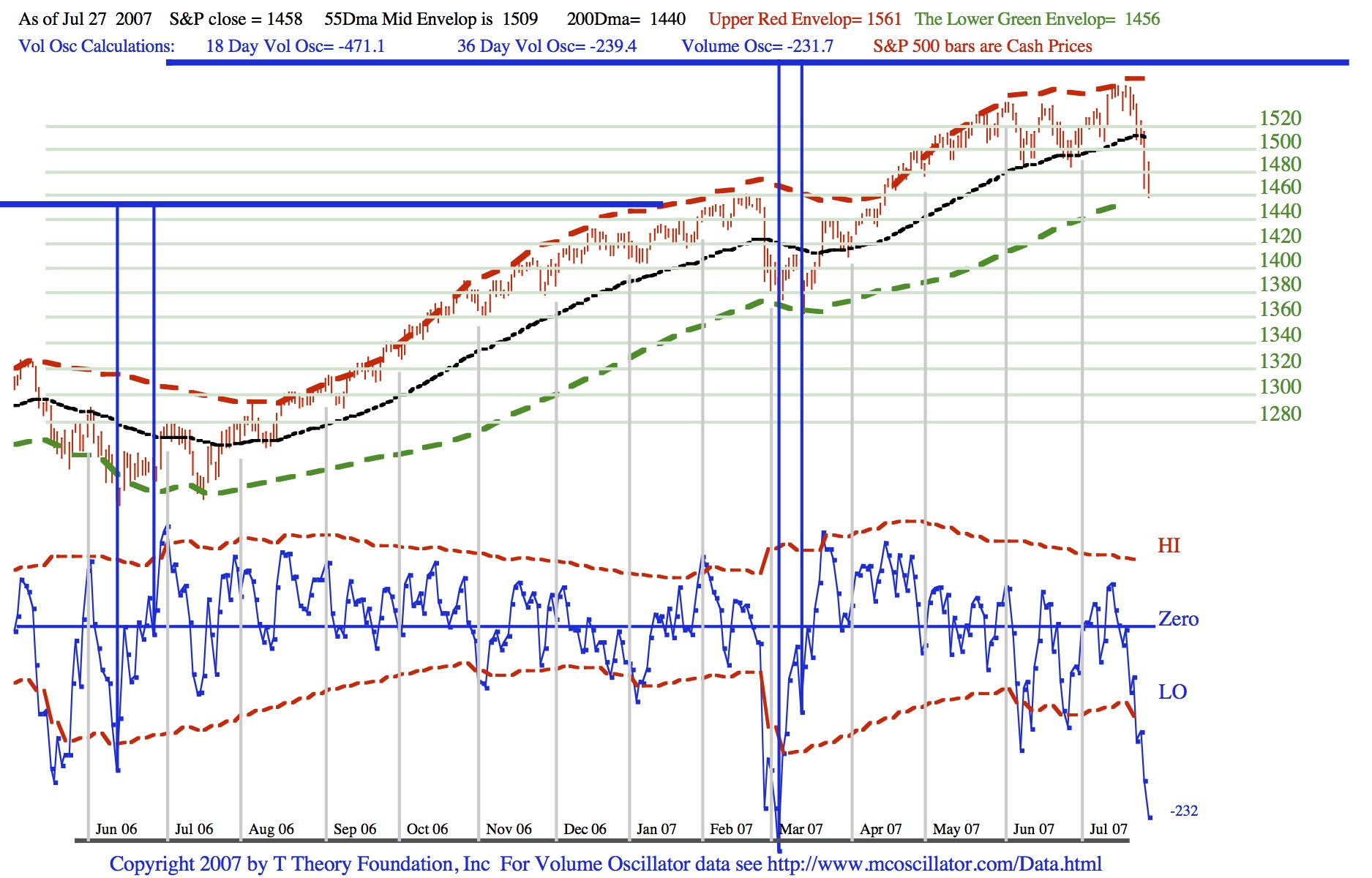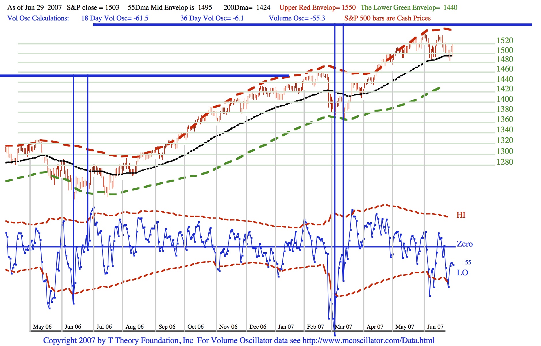 When the volume oscillator failed to sustain the rising bottoms pattern previously generated as the S&P found a double bottom on the black 55 day MA then the possibility existed that a drop to the green bound at S&P 1456 would occur. This conclusion comes from what I called envelope theory which summarizes history as having a trend that can only jump from one of the three envelope lines to one of the other two. This is only approximately true for the exact levels noted in the chart, however it is universally true as a way to think of new trends because the option is only for two new outcomes, which you will eventually figure out with experience and help from other indicators.